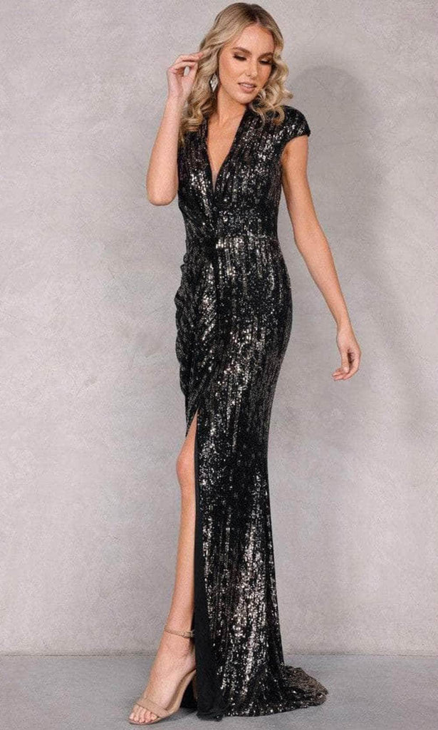 Make him fall in love with you all over again in this luminous terani Couture 2021E2860 creation. Styled with a spectacle of contrasting sequins and beadwork that catches the light, this gown parades with a plunging v-neckline and a sheer inset. Draped with dainty cap sleeves and a full back, this ensemble showcases fine drapes as it parts with a slit and creates a sheath silhouette with a sweeping train. Surround yourself with upscale glamor in this glimmering terani Couture masterpiece. Model is wearing the Black Gold color.