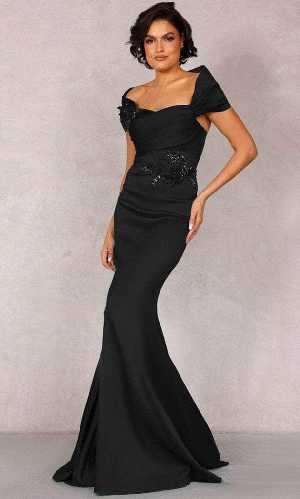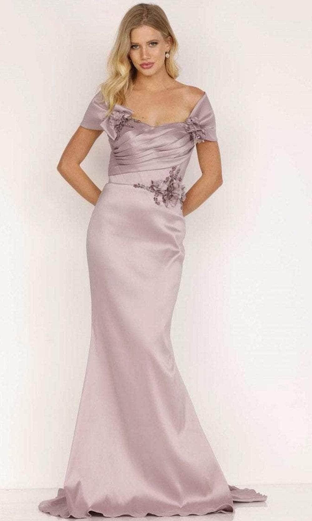 Entice the crowd with your fascinating flair in this richly ornate Terani Couture 2021M2969 creation. Flaunting shawl design sleeves wrapping the shoulders and arms, this beauty parades with an off shoulder design atop a pleat detailed bodice. Festooned with beaded floral applique details on the bodice and midriff, the mermaid skirt slides along the feminine curves to create a lush pool of train. Endlessly captivate the crowd with your presence in this Terani Couture masterpiece. Models are wearing the Black, Emerald, Navy, Red, Wine, Rose and Mauve colors.