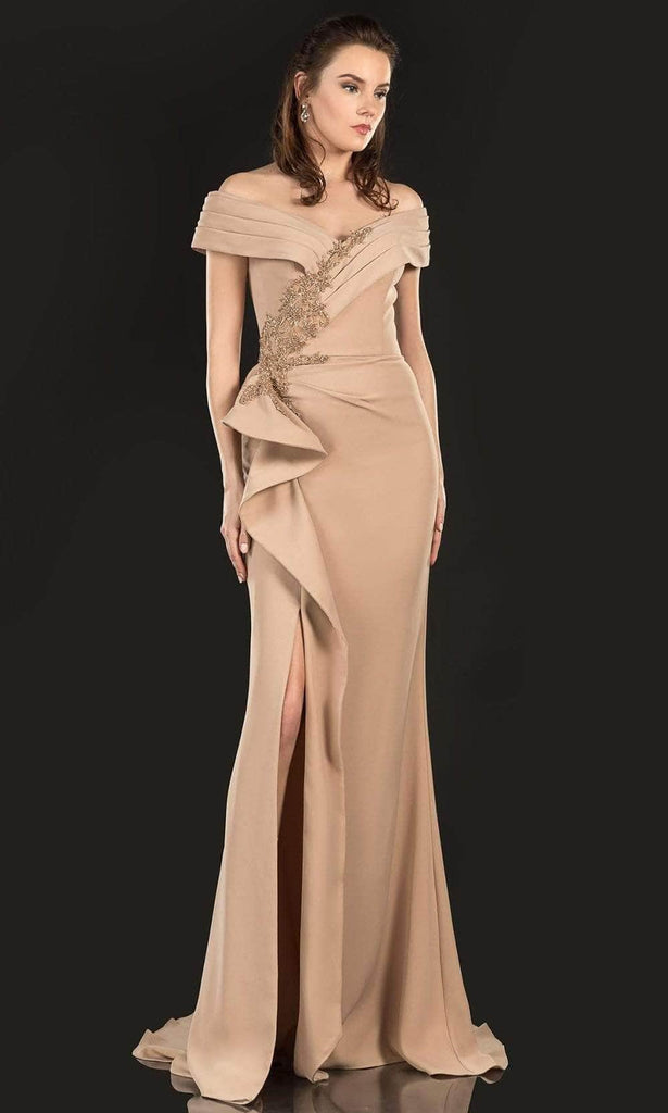 Astound everyone with this Terani Couture 2021M2986 gown captivating beauty. This elegant outfit is perfectly tailored with an off-the-shoulder neckline to accentuate your collarbones and it comes with a stylish pleated detail. The beaded appliques and side draping leading to the skirts high leg slit add a hint of glamour. A majestic sweep train and a full-length sheath skirt finish this figure-flattering gown. This Terani Couture 2021M2986 masterpiece is a stunning look for any special event. Models are wearing Mocha, and Sapphire colors.