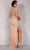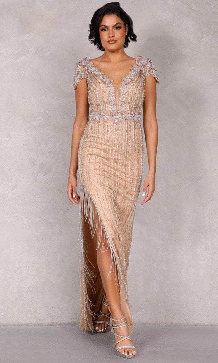 Shine with an extravagant flair in this magnificent Terani Couture 2027GL3259 creation. Parading a spectacle of intricate floral appliques and beadwork donning its length, this stunner showcases a deep v-neckline with an illusion inset. Draped with ornate cap sleeves and a semi-sheer full back, the sheath skirt is crowned with a floral ornate belt and accented with bead fringed slit as it falls into a brush of train. Glide into a room a claim the attention of many wearing this exceptional Terani Couture masterpiece. Model is wearing the Nude color.