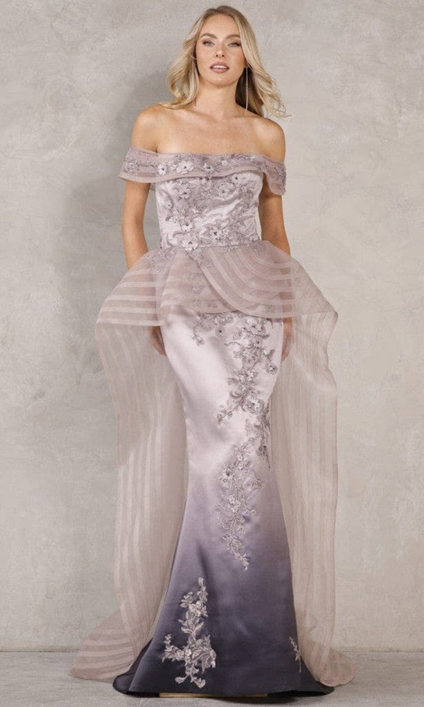 This elegant Terani Couture 2111E4746 is sure to make you the center of everyone’s attention. Adorned in floral embellishments throughout the dress, the sheer folded off-shoulder neckline tops the fitted bodice, complemented with a mid-open back with zipper closure. Styled in sheer peplum attached on the waist cascading into court train length giving additional drama on the dress. Terani Couture ensemble is simply breathtaking. Terani Couture gowns are made to reveal the elegant and classy side of women who wear them.