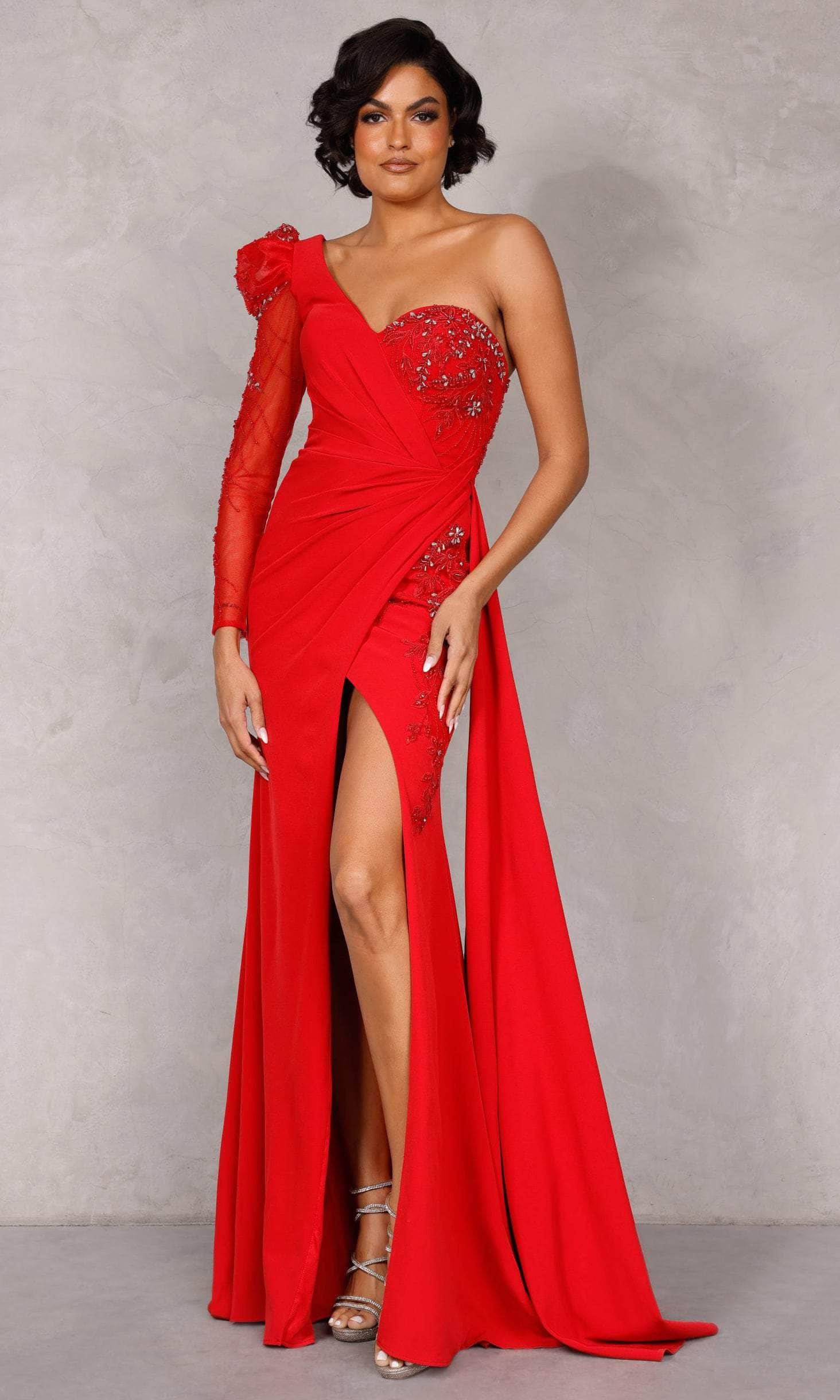 Indulge in a lush style that expresses extravagance in this Terani Couture 2214E0164 creation. Perfectly styled with tailoring lines and embellished with beadwork, this stylish piece reveals an asymmetrical neckline with a gathered drape accenting the bodice. Highlighted with a puff detail and a beaded sheer long sleeve, the skirt opens up with a sexy slit as it cascades to the floor with a sweeping denouement. Shine with an extravagant flair in this magnificent Terani Couture masterpiece. models are wearing the Blush, Emerald and Red colors.