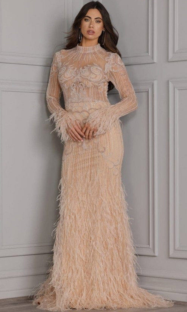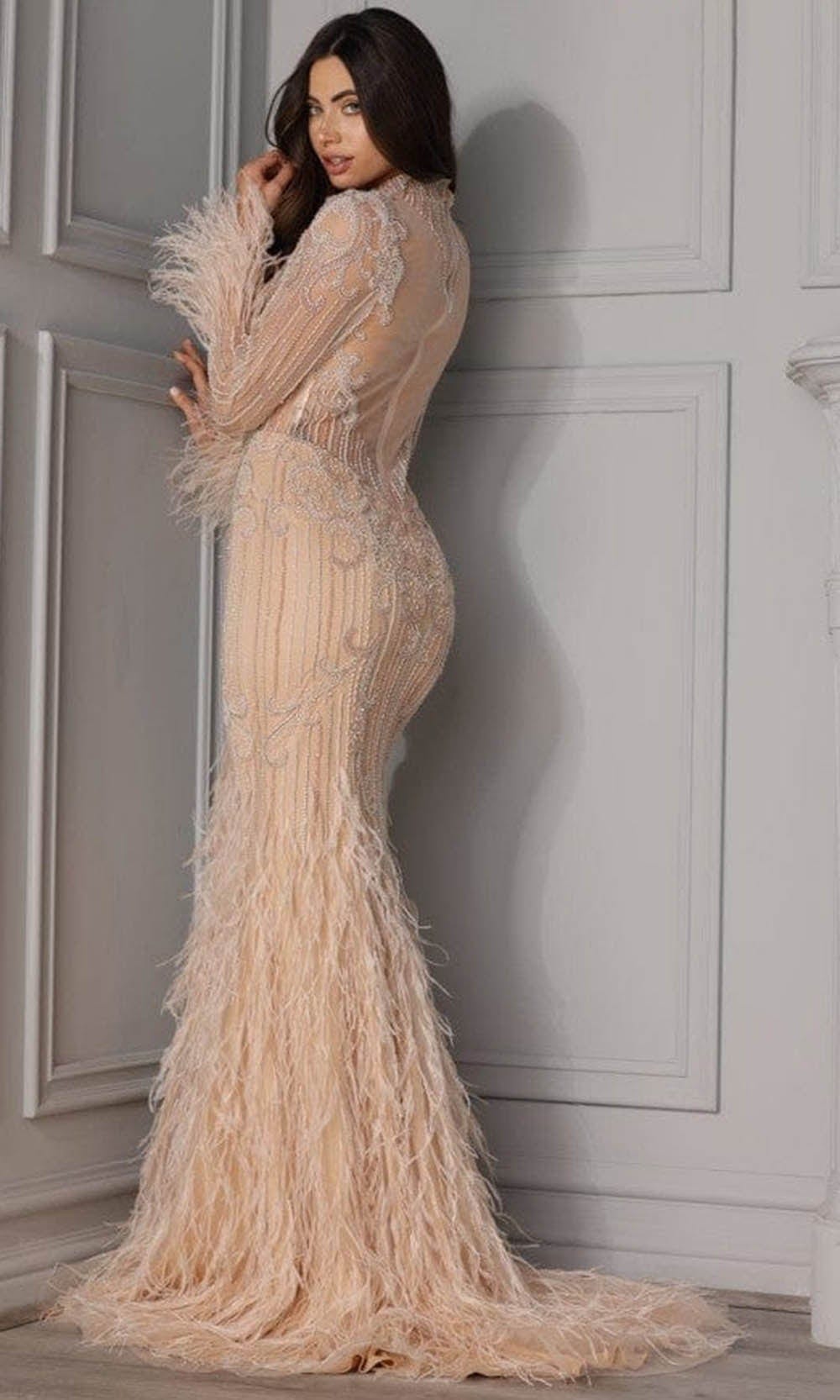 Walk in glamour and let all heads turn on you in this creation by Terani Couture 2214GL0108. This ensemble showcases a sheer bodice with a high neckline and long sleeves in a fitted and intricately beaded embellished bodice. This also highlights a feathers design around the cuffs and skirt. Defined with full back, the full-length trumpet skirt gorgeously finishes in a sweep train. Mesmerize the crowd with your sophisticated flair in this Terani Couture masterpiece. Terani Couture gowns are made to reveal the elegant and classy side of women who wear them.