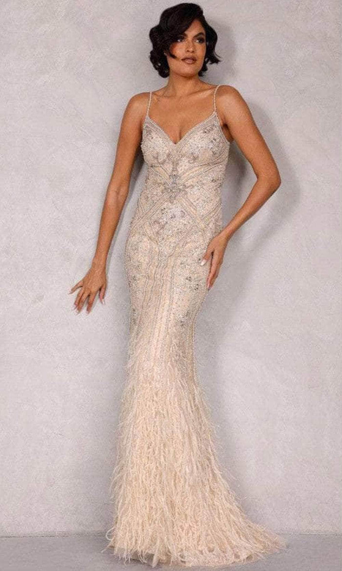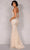 Show off your trendsetting style when you wear this Terani Couture 2221GL0413. A beautiful and elegant polyester full-length sleeveless formal dress with thin straps that holds the fitted bodice ornately designed with jewel embellishments and a V-neckline adorned with patterned elegant beads. The back of this dress has a zipper closure. The skirt has a unique appearance that features a mermaid silhouette that flows down the hips and flutters into a delicate train. Showcase your inner brilliance and alluring style in this glamorous Terani Couture masterpiece. Model is wearing Cream color.
