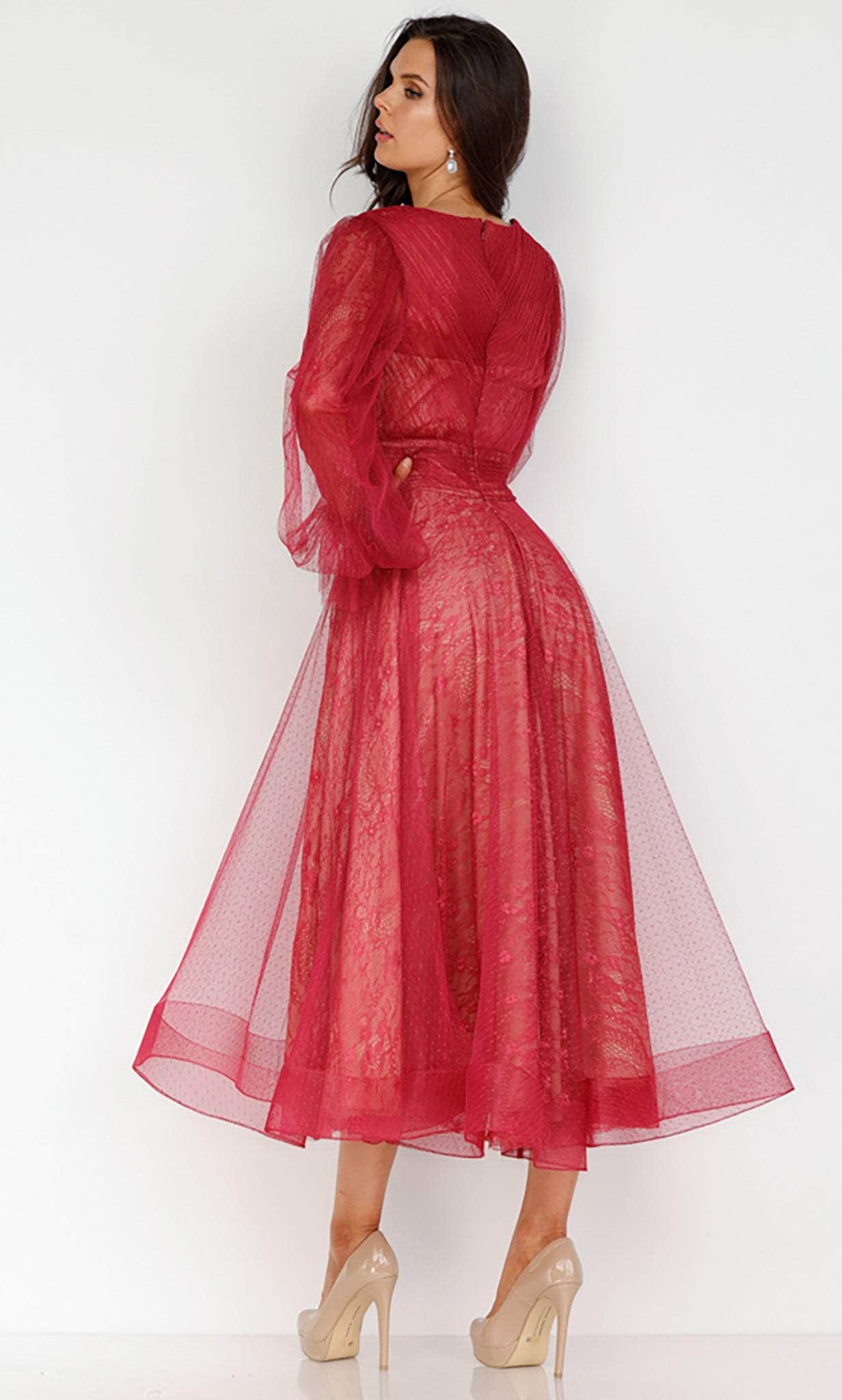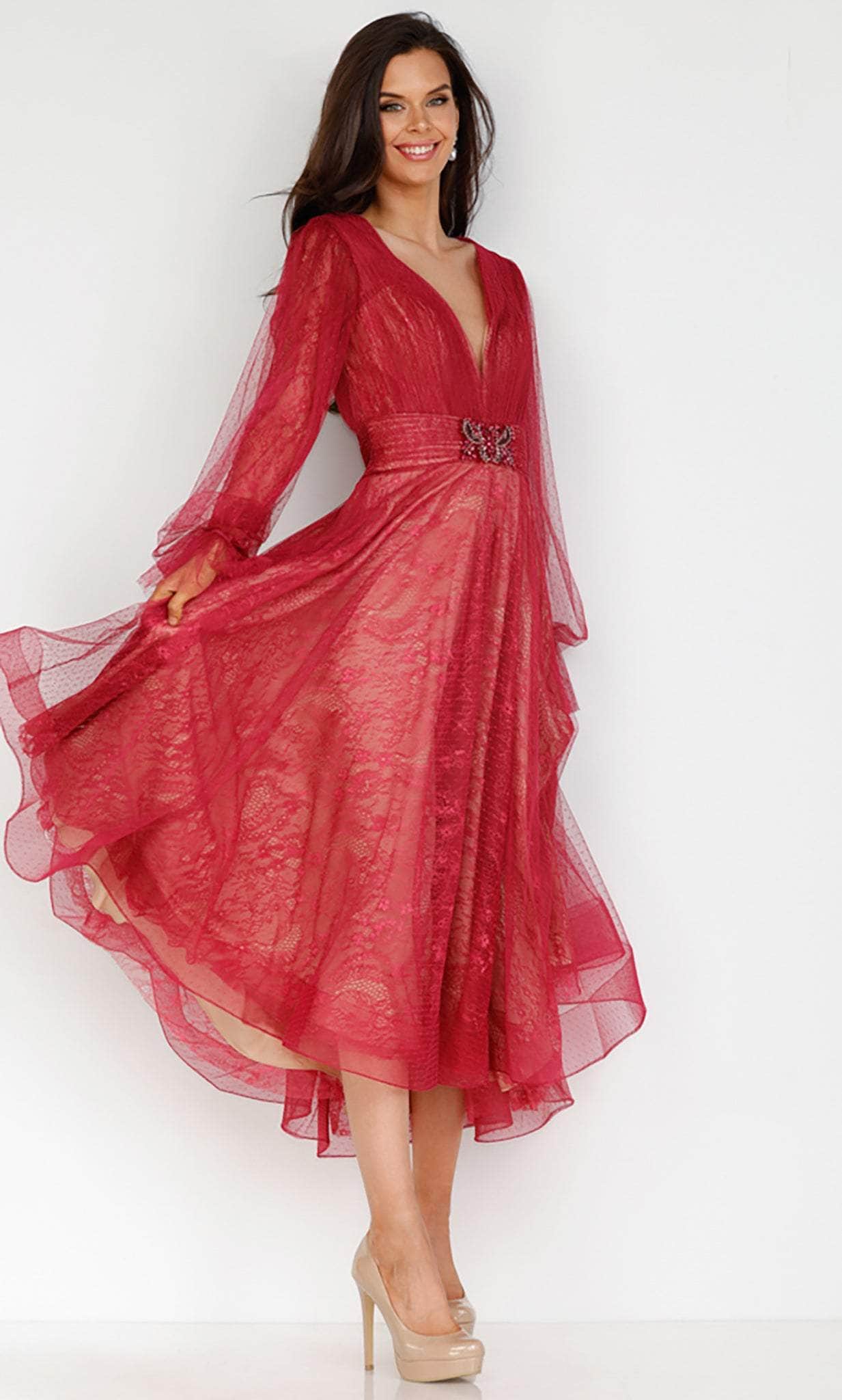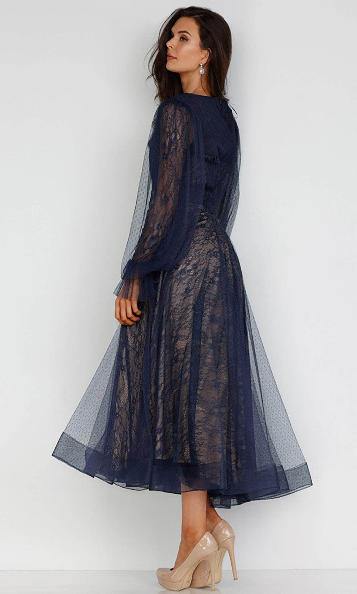 Draw admiration in this Terani Couture 231C0224 creation, designed to exude finesse and opulence! Draped with gossamer layers of lace on a sweetheart lining, this ensemble starts off with a plunging v-neckline and sheer bishop sleeves. Intricately textured with fine ruching on its bejeweled waistband and full back, tiers ornate the skirt as it cascades into a lace A-line silhouette with a tea-length hem. This Terani Couture 231C0224 masterpiece offers a sophisticated style that will surely turn heads. Models are wearing the Navy Nude and Wine Nude colors.