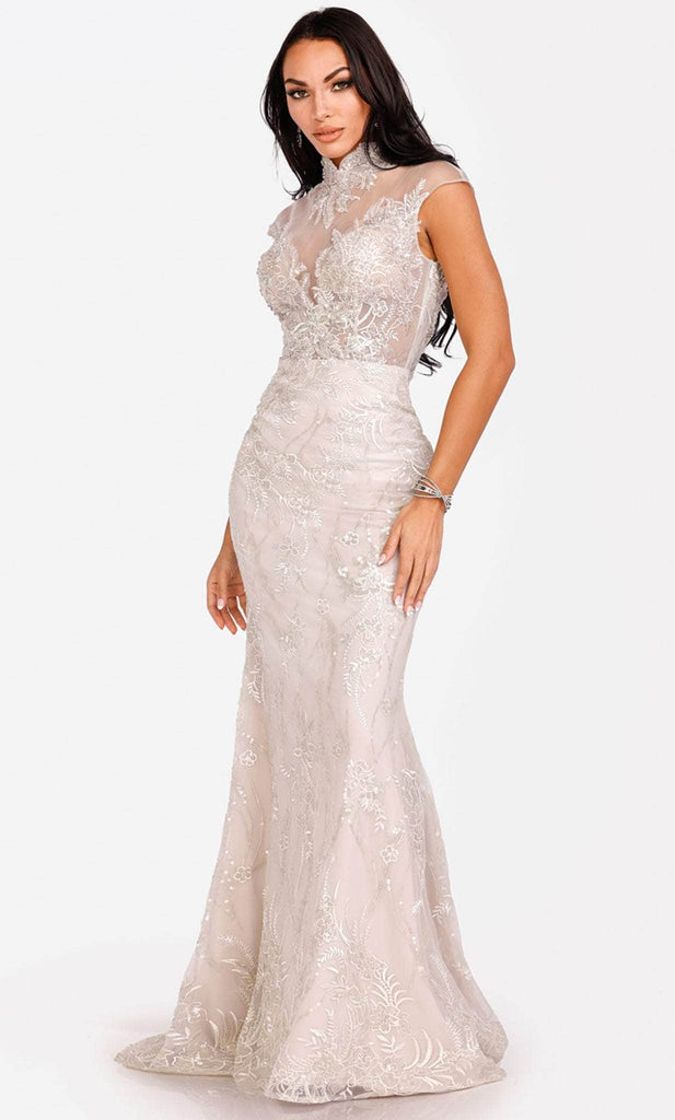 Look immaculate and classy wearing thisTerani Couture 231E0257 creation. Festooned with glimmering embroidered details and sequin accents, this gown reveals an illusion high neckline with dainty cap sleeves. Forming a sweetheart lining coupled with an illusion styled back, the silhouette is rendered with an opulent mermaid skirt that skims and releases at the knee into a soft flourish of train. Flatter your finest assets as you enthrall the crowd in this Terani Couture 231E0257 masterpiece. Model is wearing the Silver color.