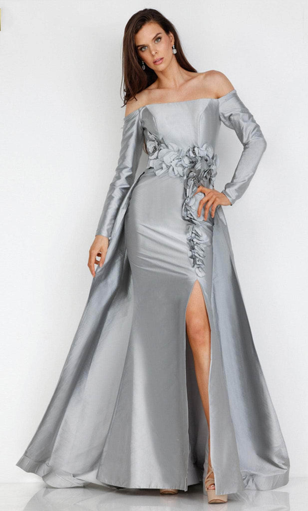 Flaunt the best features while captivating the crowd in this Terani Couture 231E0280. Beautifully tailored from orbit taffeta fabric and ornate with 3D floral embellishments to highlight the fitted bodice. This gown reveals off-shoulder sleeves trailing into a straight-across neckline. The mid-open back is secured with a center zipper closure and the sheath skirt with a side slit is draped with an A-line overskirt that cascades into a train. Orchestrate a spectacular evening of dazzling sophistication in this luxurious Terani Couture 231E0280 creation. Model is wearing Platinum color.