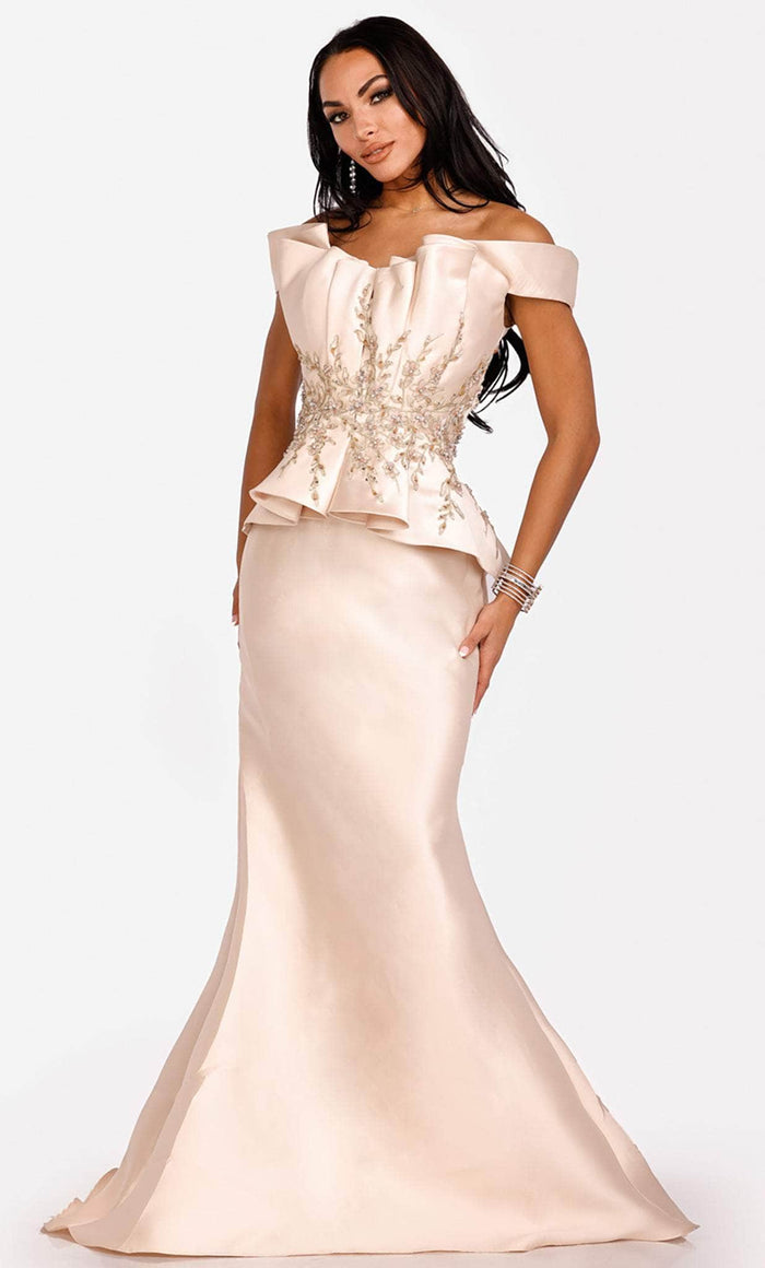 Adorn yourself in an utterly feminine style in this stylishly designed Terani Couture 231E0509 creation. Accented with pleated details gathering in a crumbcatcher design, this gown parades an off shoulder neckline with foliage embellishments accentuating the natural waist. Designed with a peplum accent, the sleekly tailored skirt reveals a mermaid silhouette with a trailing train. Wrap yourself with the flair of a style star in this Terani Couture masterpiece. Model is wearing the Almond color.