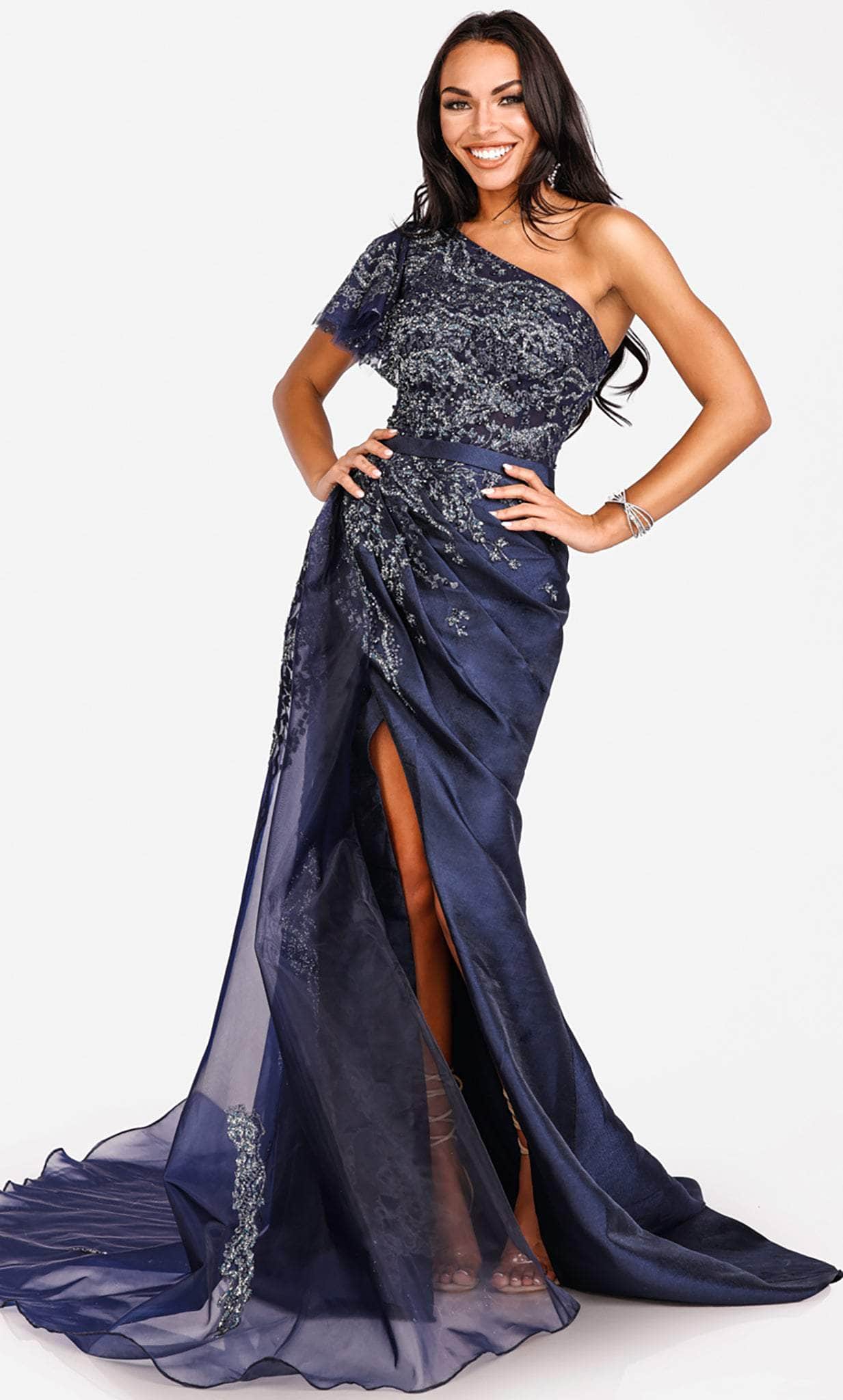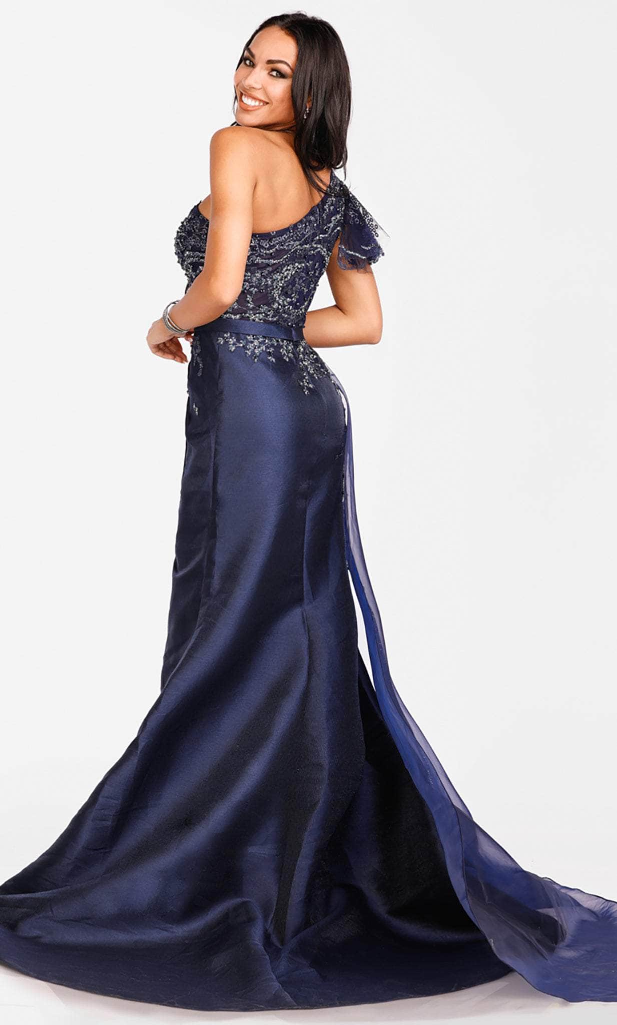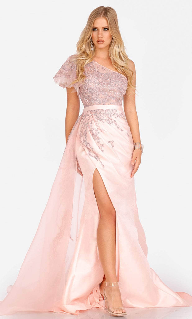 When you wear this stylish Terani Couture 231E0517 you will exude feminine elegance and flair. The one-sleeve bodice of this winning piece is glamorously embellished with sparkling rhinestones. The asymmetrical neckline is framed with a ruffle sleeve that adds a glamorous touch to your appearance. The waistline is cinched with a thin satin waistband with a detachable overlay skirt that touches the floor. A slit is added in the full-length skirt that parades in a sheath silhouette. This Terani Couture 231E0517 look will definitely bring out your inner goddess! Model is wearing Slate color. Find more mother of the bride dresses.