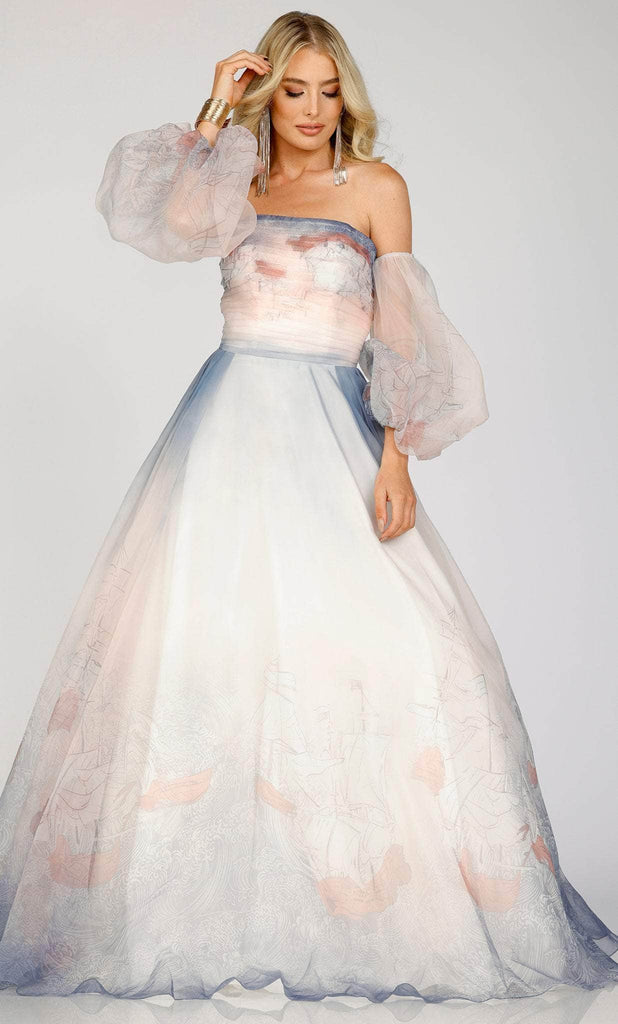 Look fantastic for your next formal event in this evening gown by Terani Couture 231E0522. Make a statement in this voluminous gown that is crafted using a tulle fabric designed with subtle print and pastel colors. Spiced up with the detachable balloon sleeves that goes perfect with a strapless, straight across neckline. The silhouette is a floor-reaching ballgown with a sweep train. This Terani Couture 231E0522 is awesome for prom or for any special night event! Model is wearing Multi color.