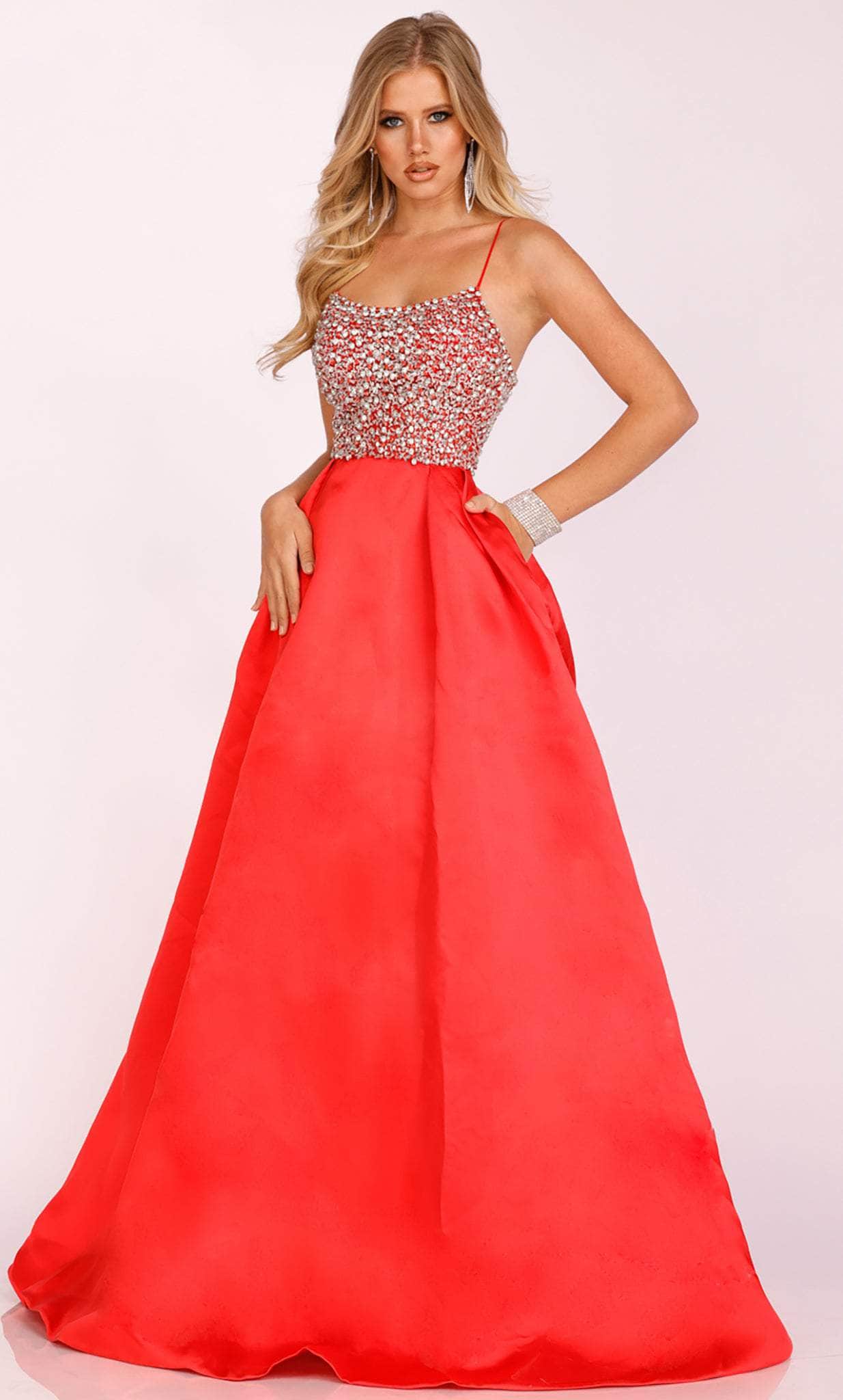 Lavish in the magnificence and beauty of this eloquently styled Terani Couture 231P0087 creation. Flaunting a sleekly tailored silhouette and glinting with faceted jewels on the bodice, this piece reveals a scoop neckline with spaghetti straps. Styled with a midrise back and a zipper closure, this vibrant ensemble parades an A-line silhouette with a trail of train. Render them speechless on the red carpet in this Terani Couture masterpiece. Model is wearing the Red color.