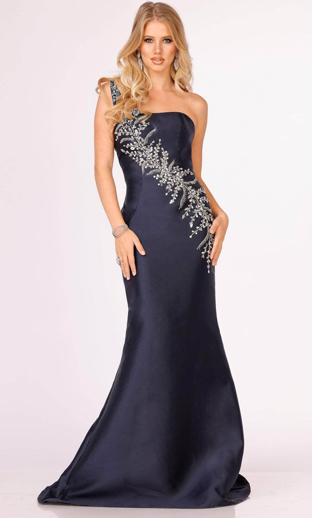 | Details: | One Sleeve, Rhinestone Embellished, Slanted Strap, Back Zipper Closure, Train, Seams |
