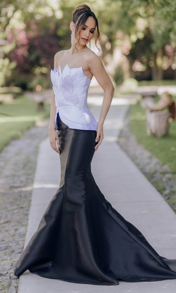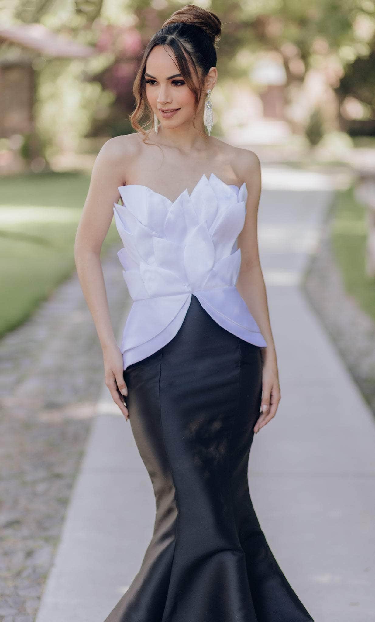 Capture the glamour as you walk on this creation by Terani Couture 232E1287. Fascinating in a structured petal bodice, this two-tone gown is strapless and features a sweetheart neckline and peplum waist. The princess seams detailing on the mermaid skirt will highlight your curves, which is finished in floor length hem and sweeping train for a dramatic flair. Exude a timeless appeal in this elegant Terani Couture 232E1287 masterpiece. Model is wearing the White Black color.