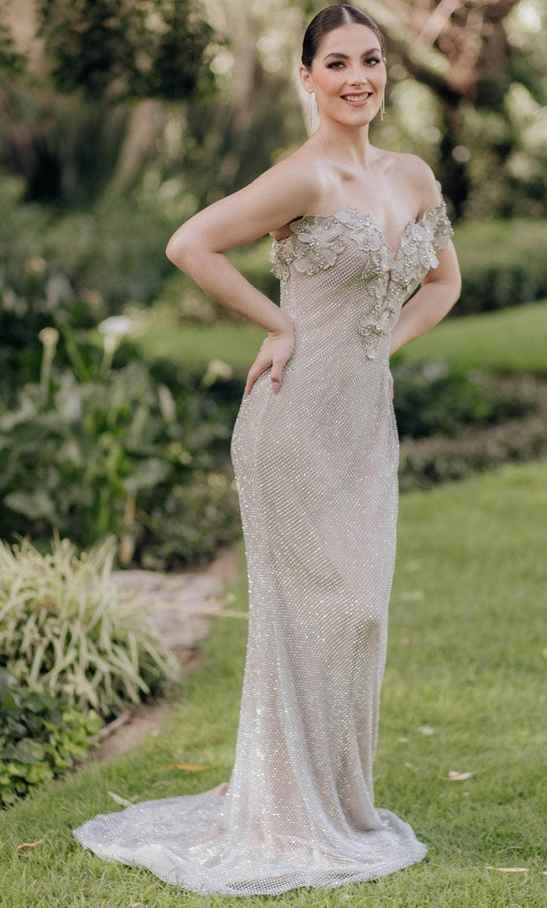 This fabulous Terani Couture 232GL1457 masterpiece will make a stunning impact. Crafted from exquisite fishnet fabric, this dress showcases a plunging sweetheart neckline adorned with breathtaking 3D floral appliques and shimmering beadwork. The mermaid silhouette gracefully accentuates your curves, while the full-length skirt flows into a sweeping train for added allure. With its impeccable design and attention to detail, this gown is perfect for capturing attention at any formal event. Step into the spotlight and embrace your inner elegance with the stunning Terani Couture 232GL1457. Model is wearing Silver Nude color.