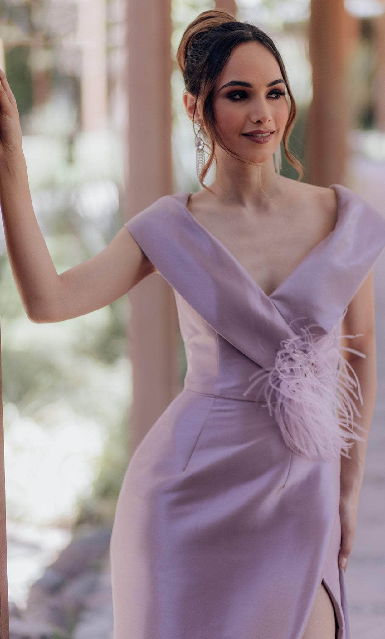 Walk in a defined sophistication and beauty wearing this evening gown by Terani Couture 232M1534. Fashioned in comfy stretch mikado fabric, this classy gown boasts a fold-over detailing on the deep v-neckline, cap sleeves, and full back. Soft feathers placed on the waist offer a playful and alluring look. The sheath skirt has a thigh-high split on one side before falling to the floor-sweeping train. An overskirt attached is the perfect finishing touch. This Terani Couture 232M1534 masterpiece is sure to be an attention-grabber on any occasion. Model is wearing the Mauve color.