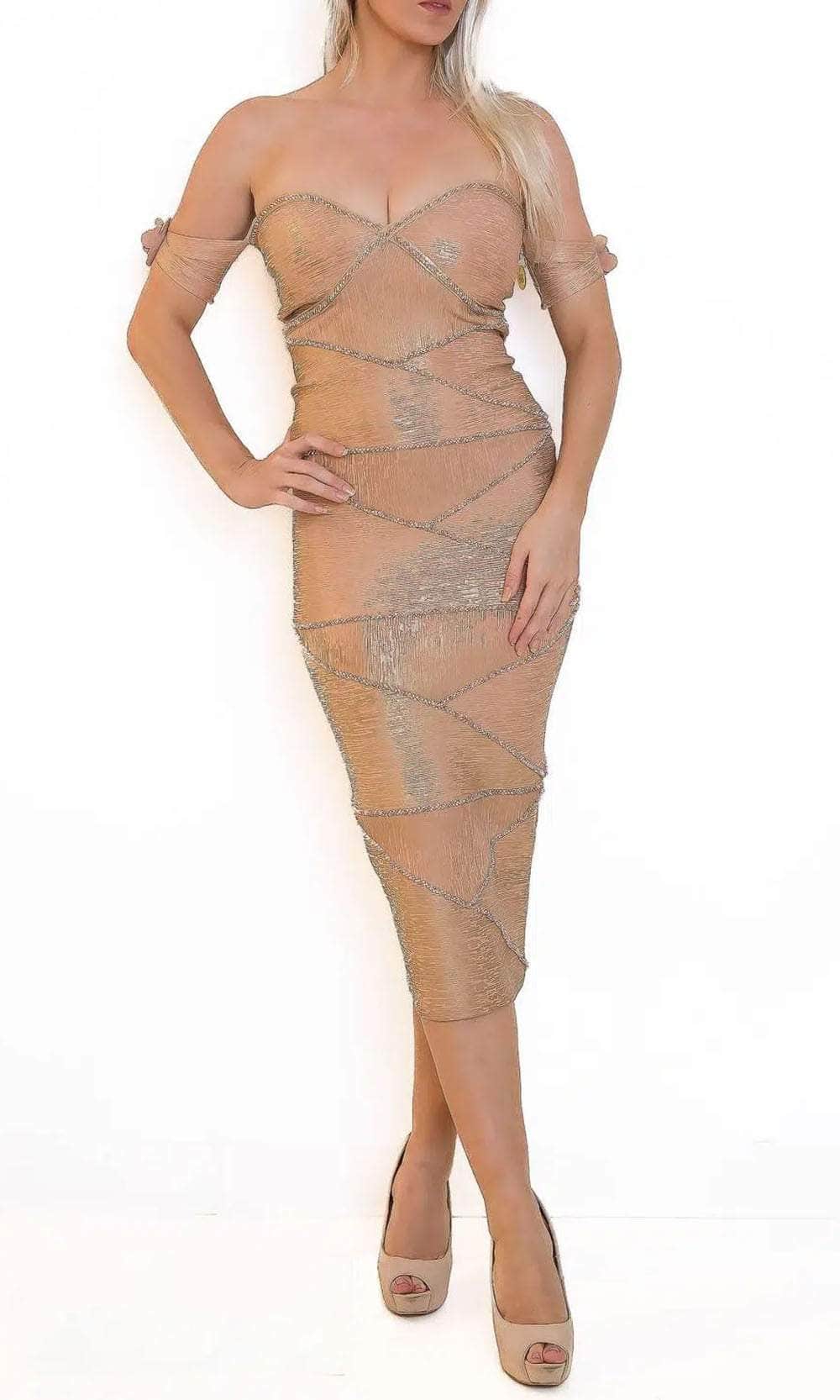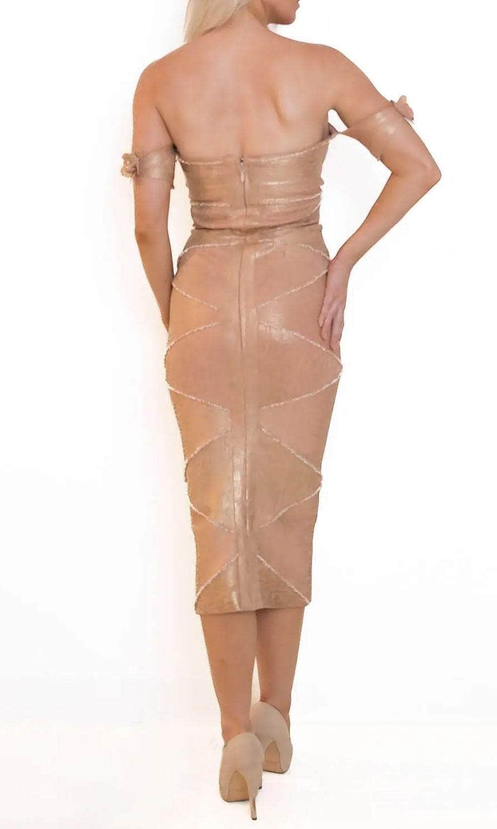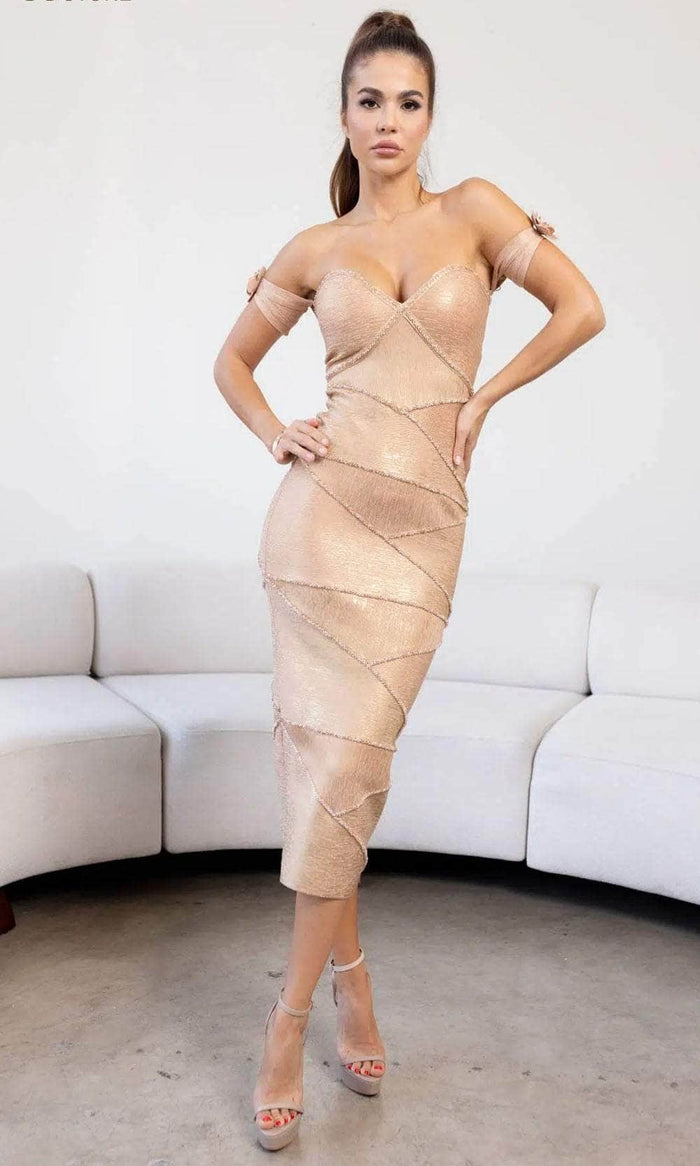 Wear this Terani Couture 241C2318 tea-length dress, which is constructed of Metallic Jacquard and promises to make you stand out with modern charm, and radiate a charm that is sure to captivate the affluent crowd. Your shoulders are elegantly framed by the off-the-shoulder sleeves and sweetheart neckline, which give a hint of appeal. Your shape is complemented by the fitting bodice, which produces a pleasing silhouette. The functional yet fashionable feature is added by the back zipper fastening. Ideal for formal events, this dress combines elegance with modern style. Make a splash in this Terani Couture 241C2318 ensemble and dazzle the audience with your classic style. Model is wearing Rose color.