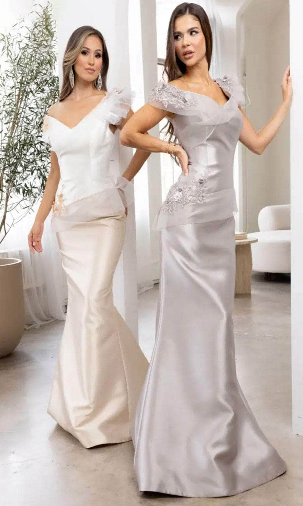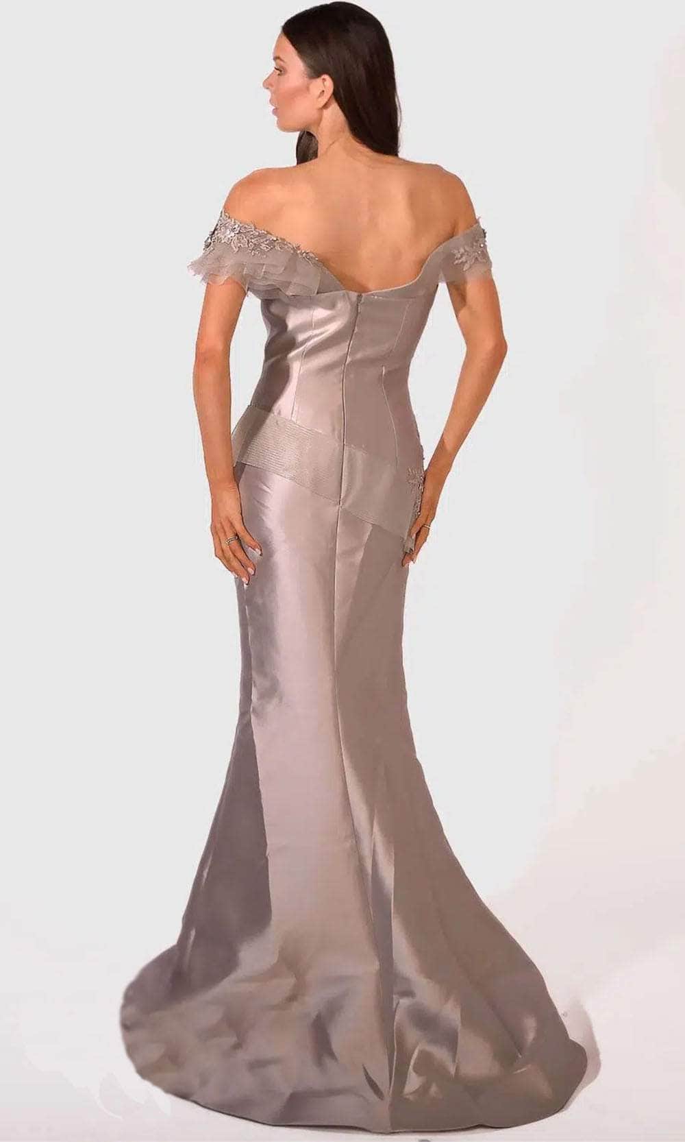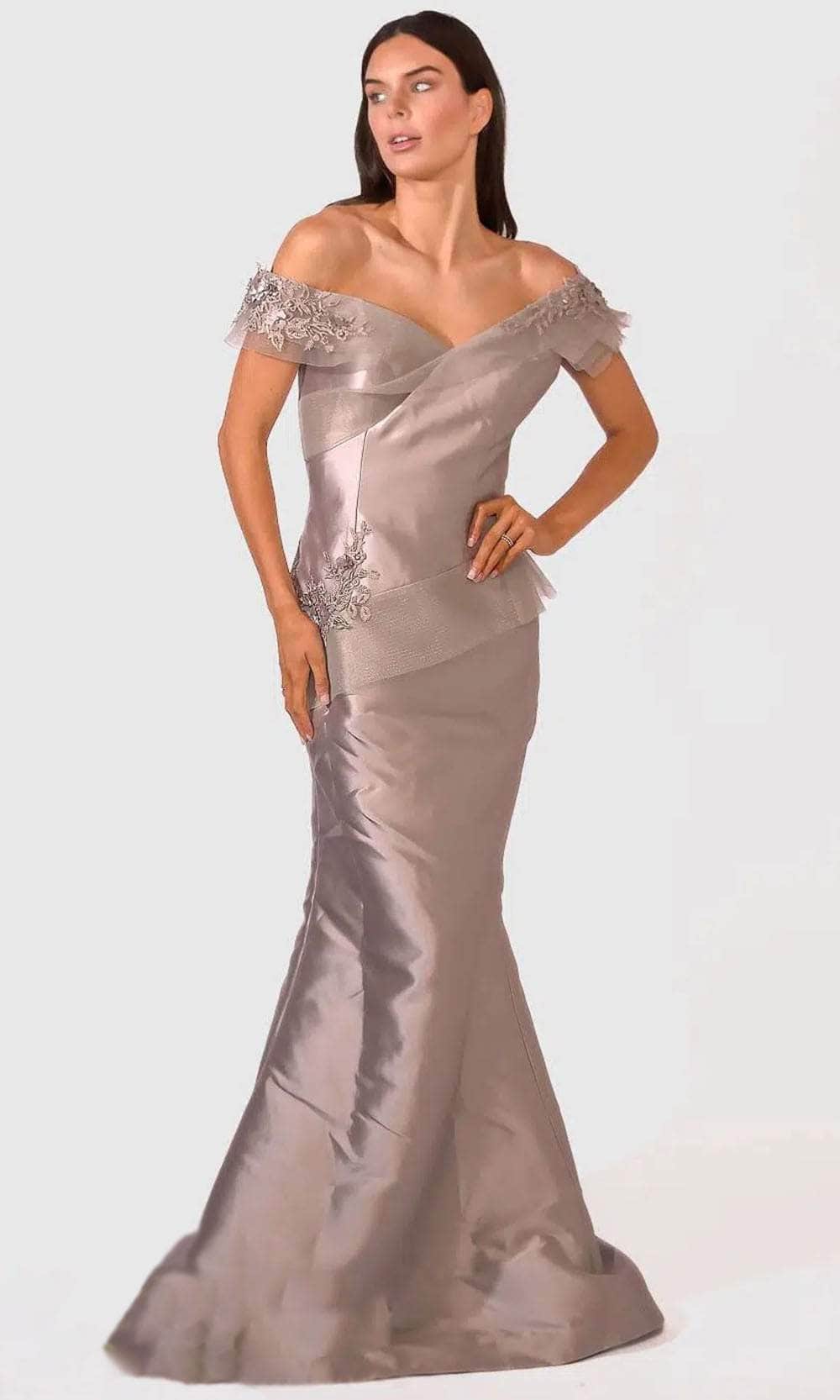 In this Terani Couture 241E2478 evening dress, look your absolute best and make it an unforgettable event. With some ruffle details on the sleeves, the fitted bodice of this dress also features an off-the-shoulder neckline. In addition, the designs feature floral embroidery. While the trumpet skirt displays a court train that ends at the floor, the back features a mid-open back with a back zipper closure. Clad in this Terani Couture 241E2478 creation, you will be in the spotlight. Models are wearing Ivory Champagne, and Taupe colors.