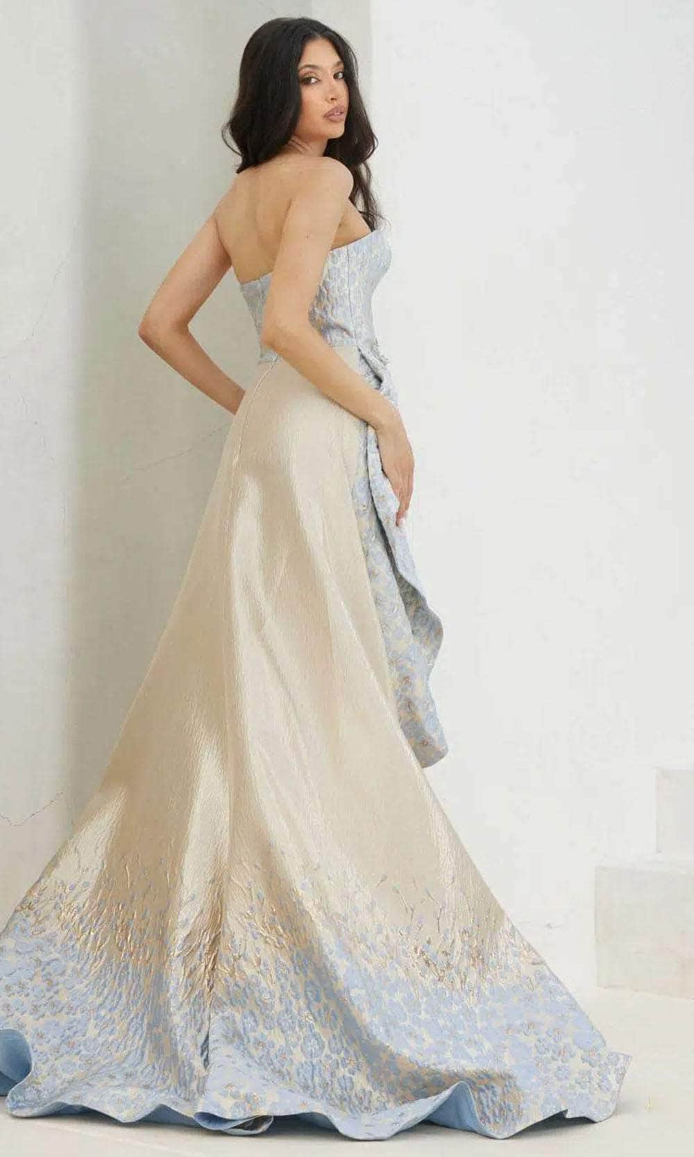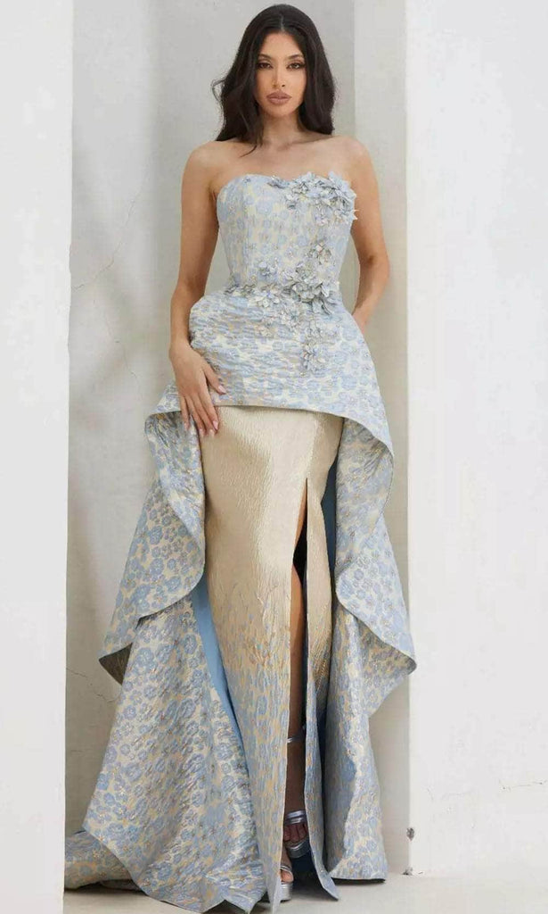 With Terani Couture 241E2486 evening dress, you can embrace your inner starlet and create a picture of effortless elegance. The strapless, fitted bodice of this dress features a straight across neckline. It has 3D floral appliques and floral print designs. The slitted sheath silhouette skirt has an A-line overskirt with a ruffled design. A zipper at the back encloses the partially exposed back. A chapel train that ends at the floor is another feature of this outfit. Show off in this eye-catching Terani Couture 241E2486 design. Model is wearing Gold Gray color.