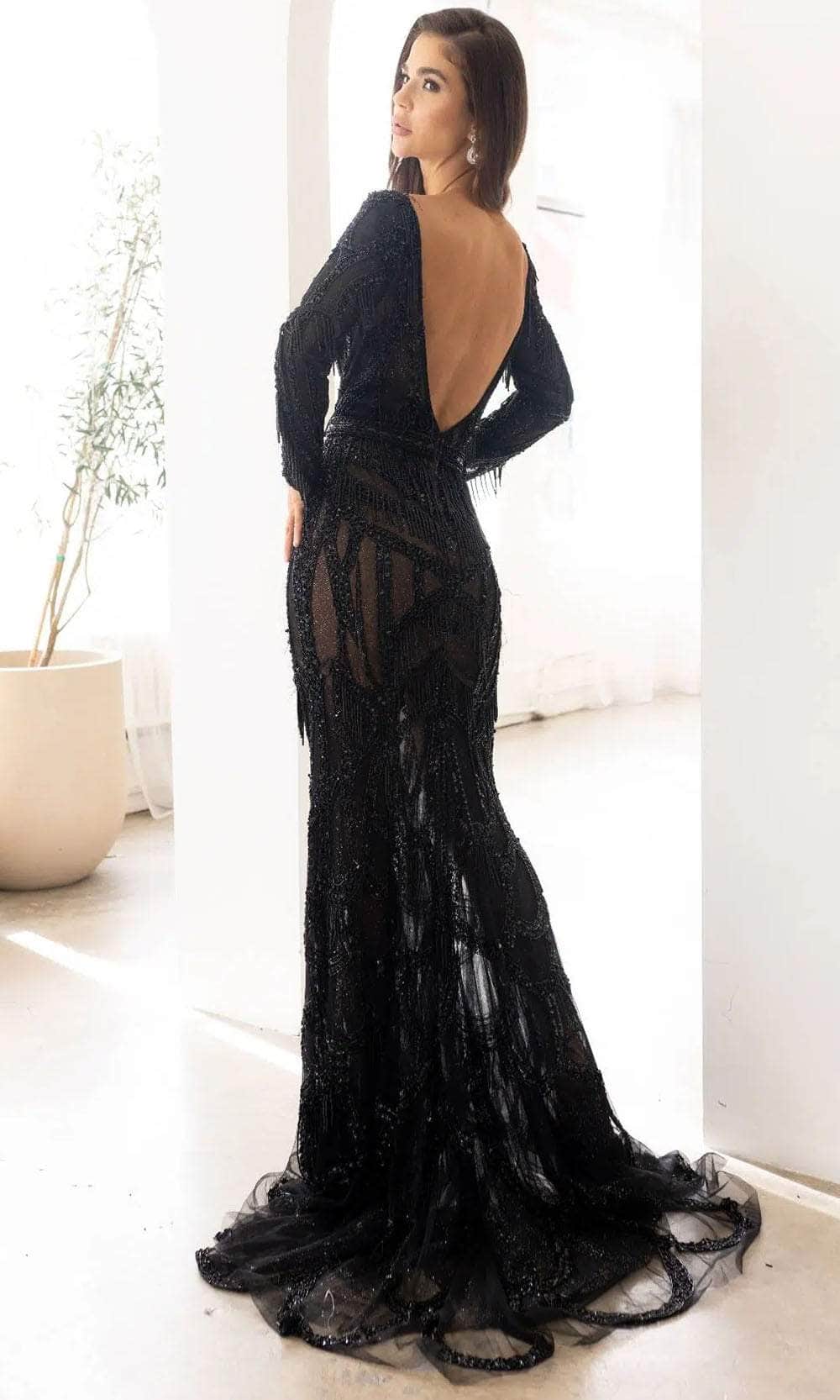 Let everyone turn heads, as you enter the party wearing this Terani Couture 241GL2610, a stunning choice for those who appreciate both grace and drama. The trumpet silhouette offers a timeless and flattering look, accentuating your figure and making you feel like the belle of the ball. The boat neckline and long sleeves add an air of sophistication, while the tulle fabric, adorned with sequins and beaded fringe, creates an ethereal and elegant effect. Choose this Terani Couture 241GL2610 to make a statement, captivating the crowd with your style and confidence. Model is wearing Black Nude color.