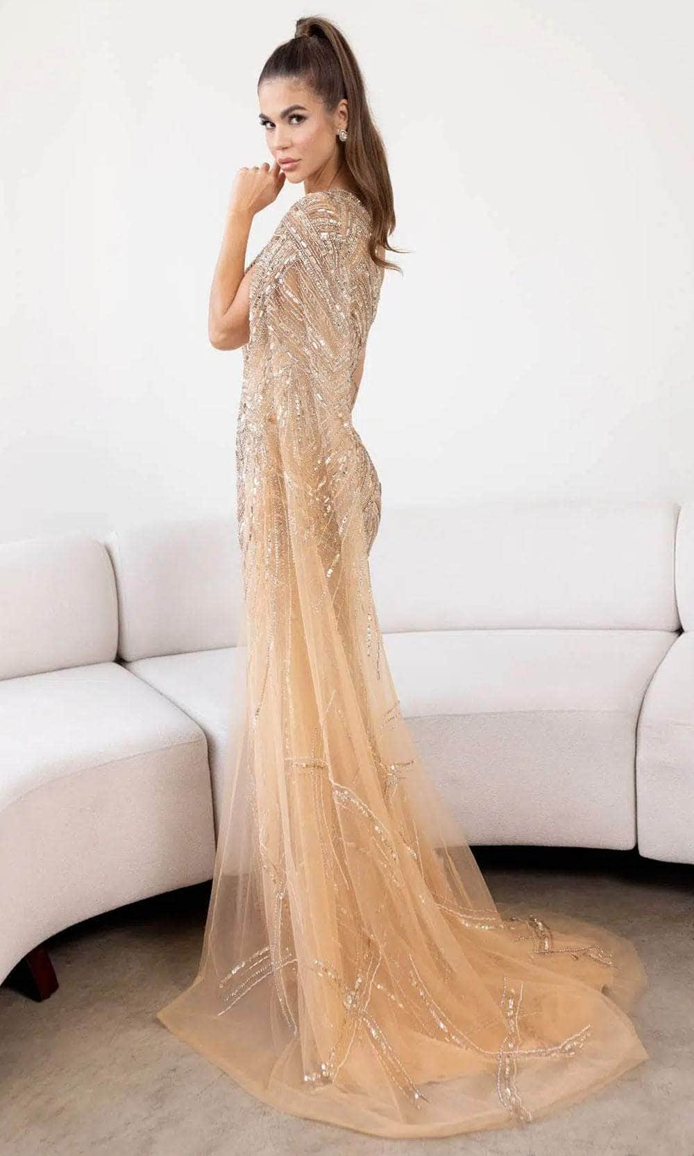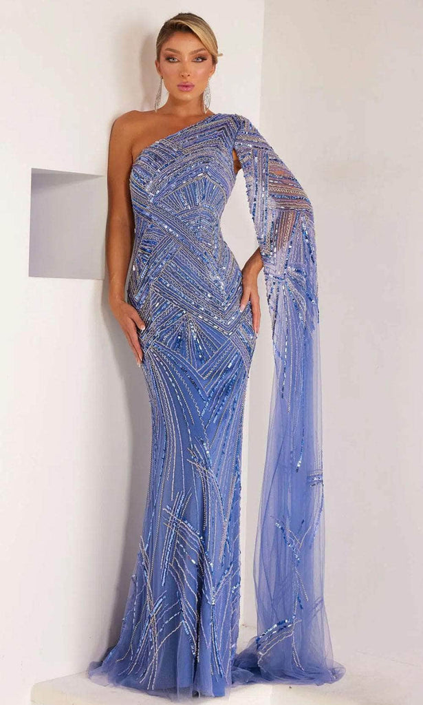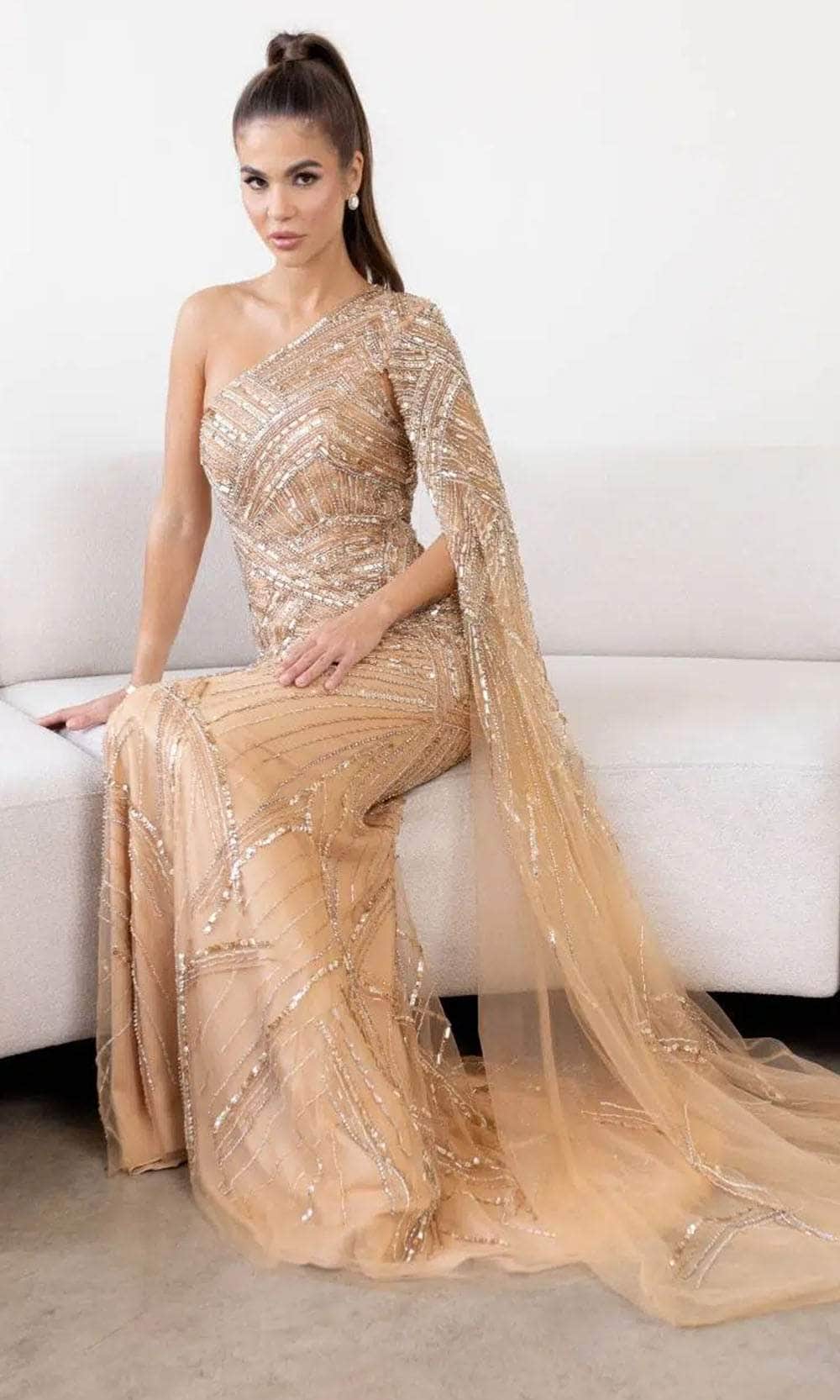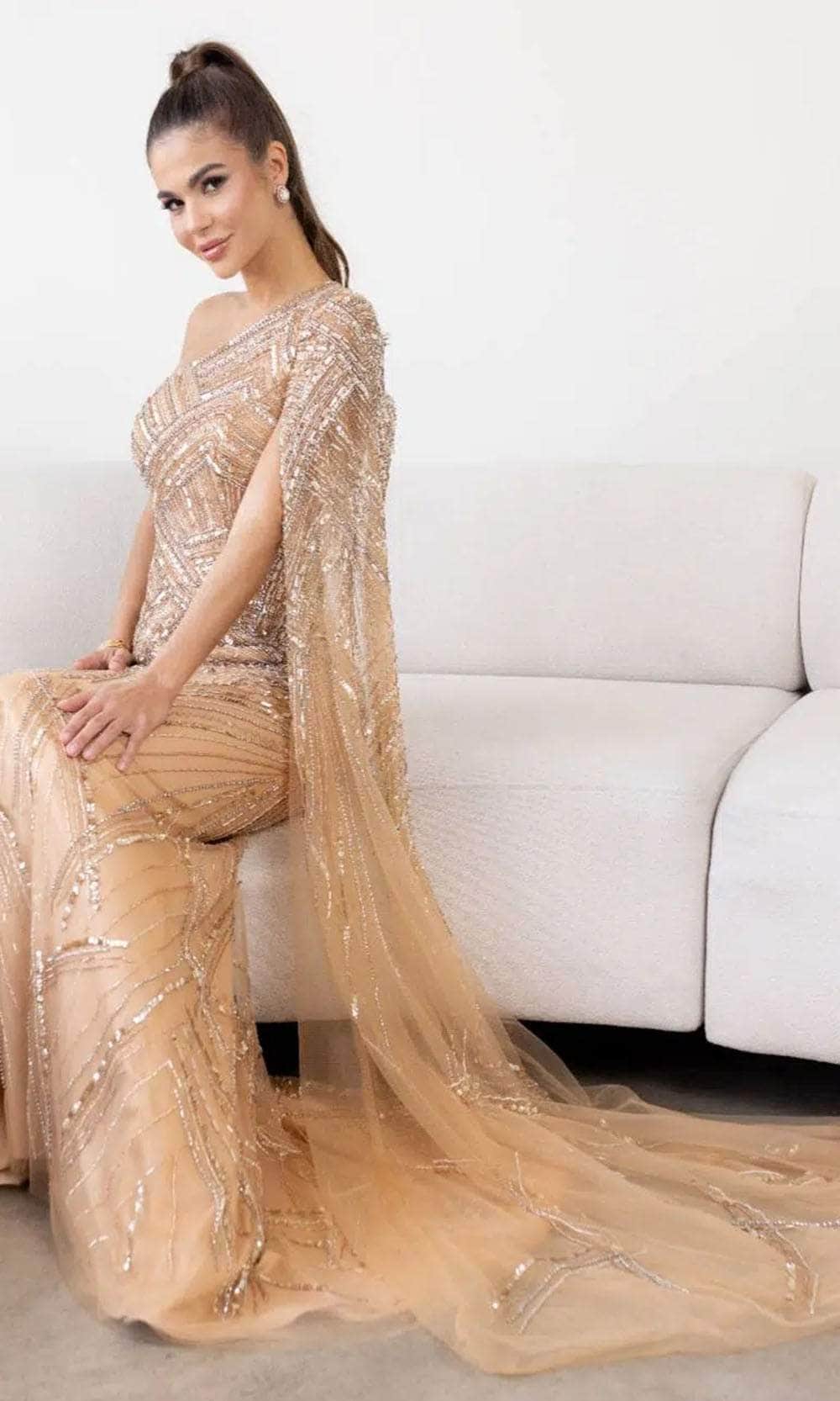 | Details: | One-Sleeve, Sequin Embellished, Long Side Cape, Train |