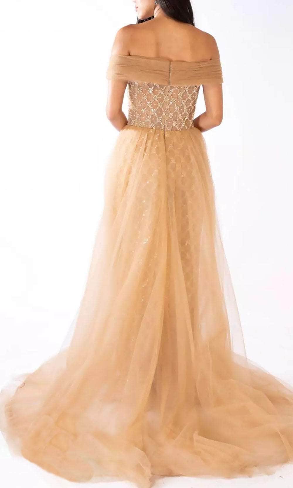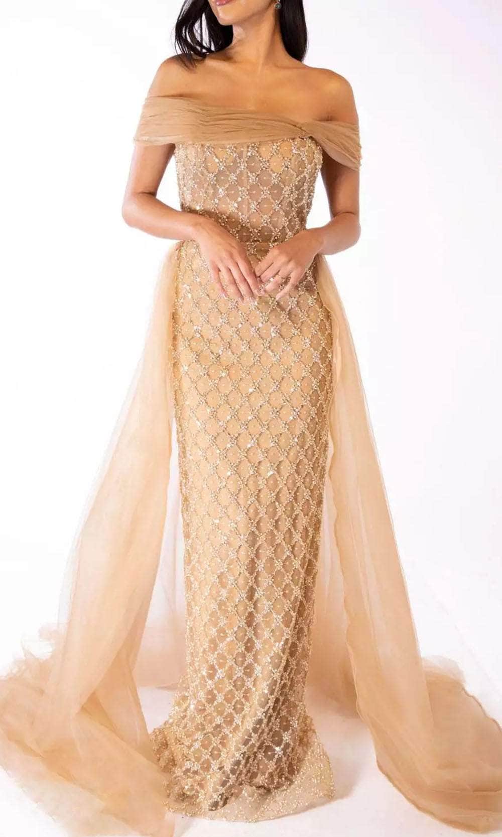 Steal the show and catch all of their attention in this classy Terani Couture 241M2706 evening dress. Displaying bead designs all over the dress, this also exhibits its charming off-shoulder neckline in a fitted bodice. The sheath skirt showcases an A-Line overskirt with a fabulous court train while the back highlights a mid-open back with back zipper closure. Make them speechless as you flaunt on your next occasion wearing this amazing Terani Couture 241M2706 masterpiece. Model is wearing Champagne color.