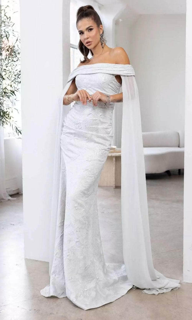 | Details: | Off-Shoulder, Pleated Details, Embroideries, Side Cape, Front Slit, Back Zipper Closure, Train |