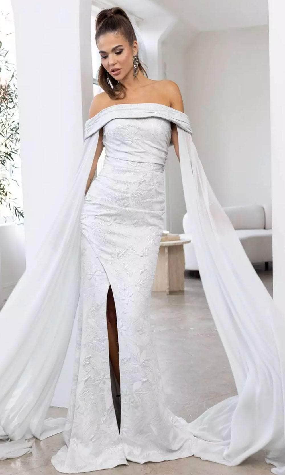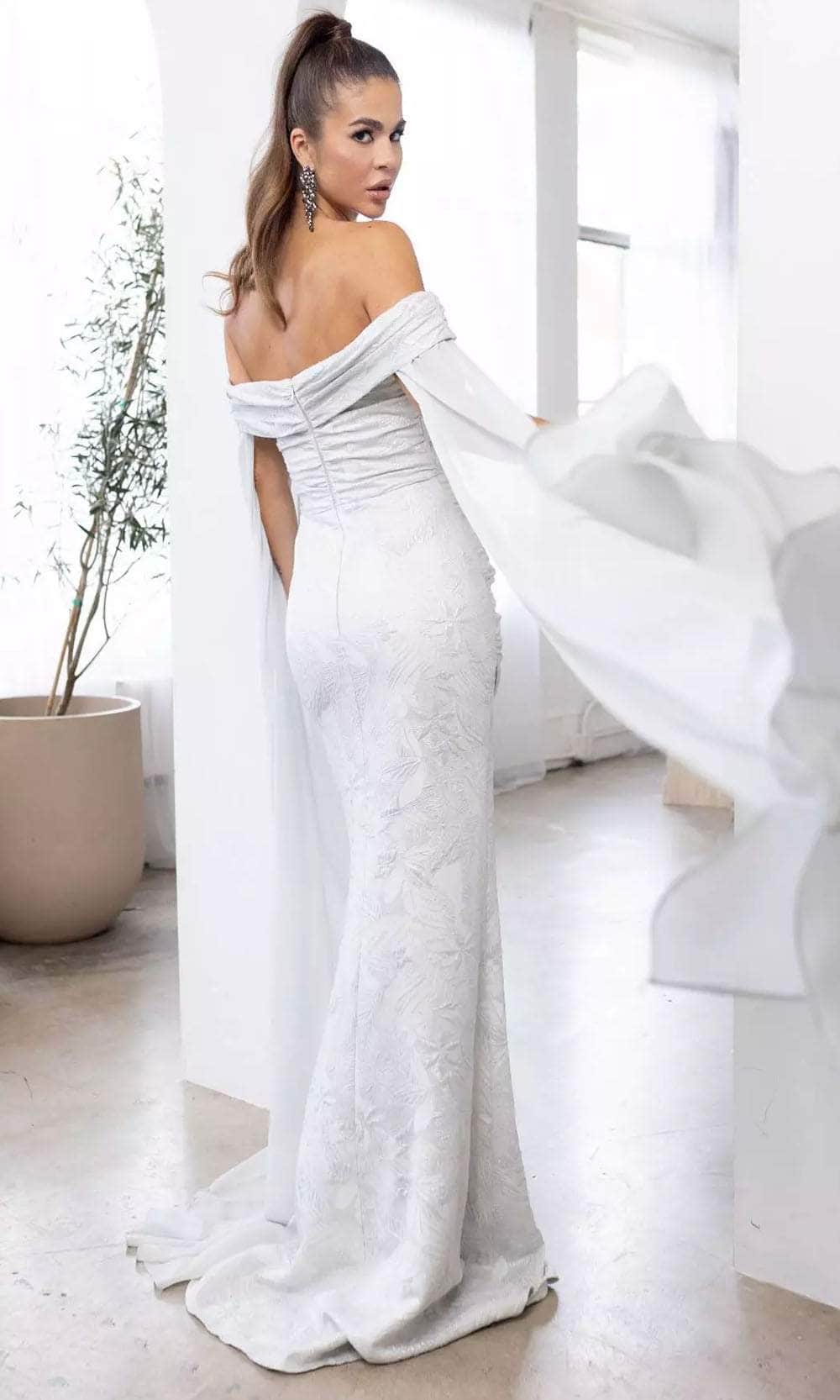 Wow everyone with this captivating Terani Couture 241M2721, a Jacquard fabric dress that elevates your evening style. The off-shoulder fitted bodice, boasting a straight-across neckline and pleated details, adds a touch of timeless charm. Intricate embroideries adorn the entire dress, creating an air of luxury. The back center zipper closure ensures a seamless fit, and the floor-length skirt, in a flattering column silhouette, finishes with a train. Side capes cascade beautifully to the floor. Terani Couture 241M2721 makes a grand statement on any special occasion. Model is wearing Silver color.