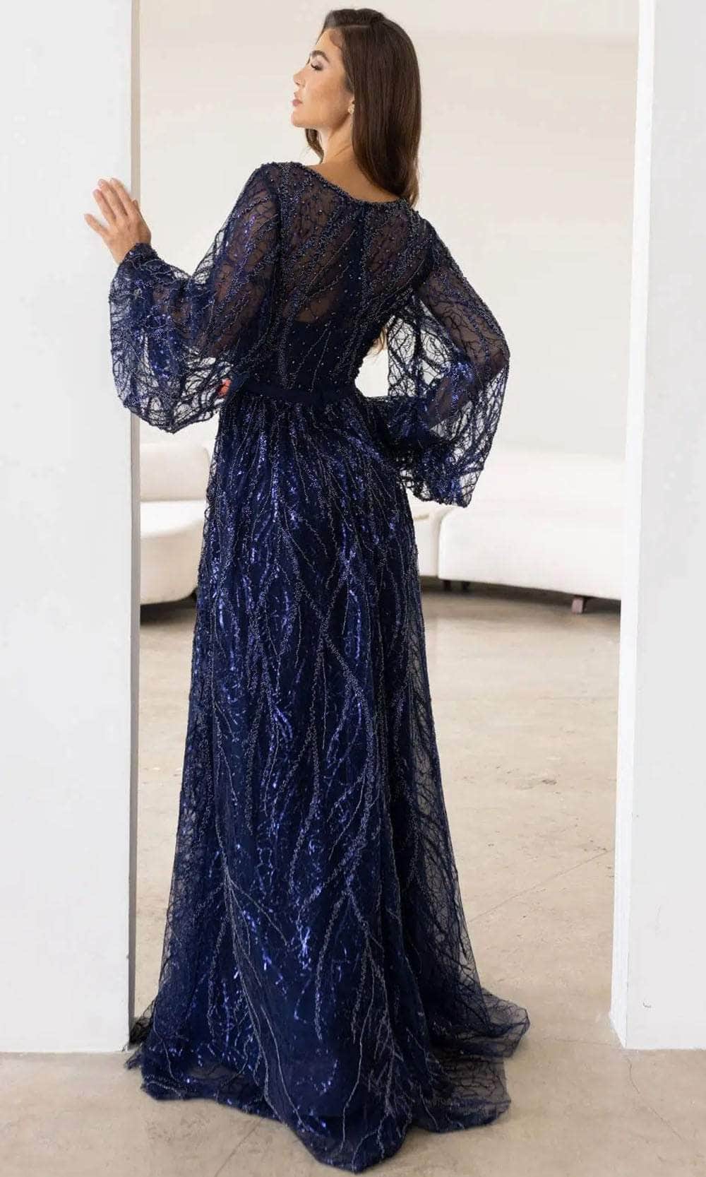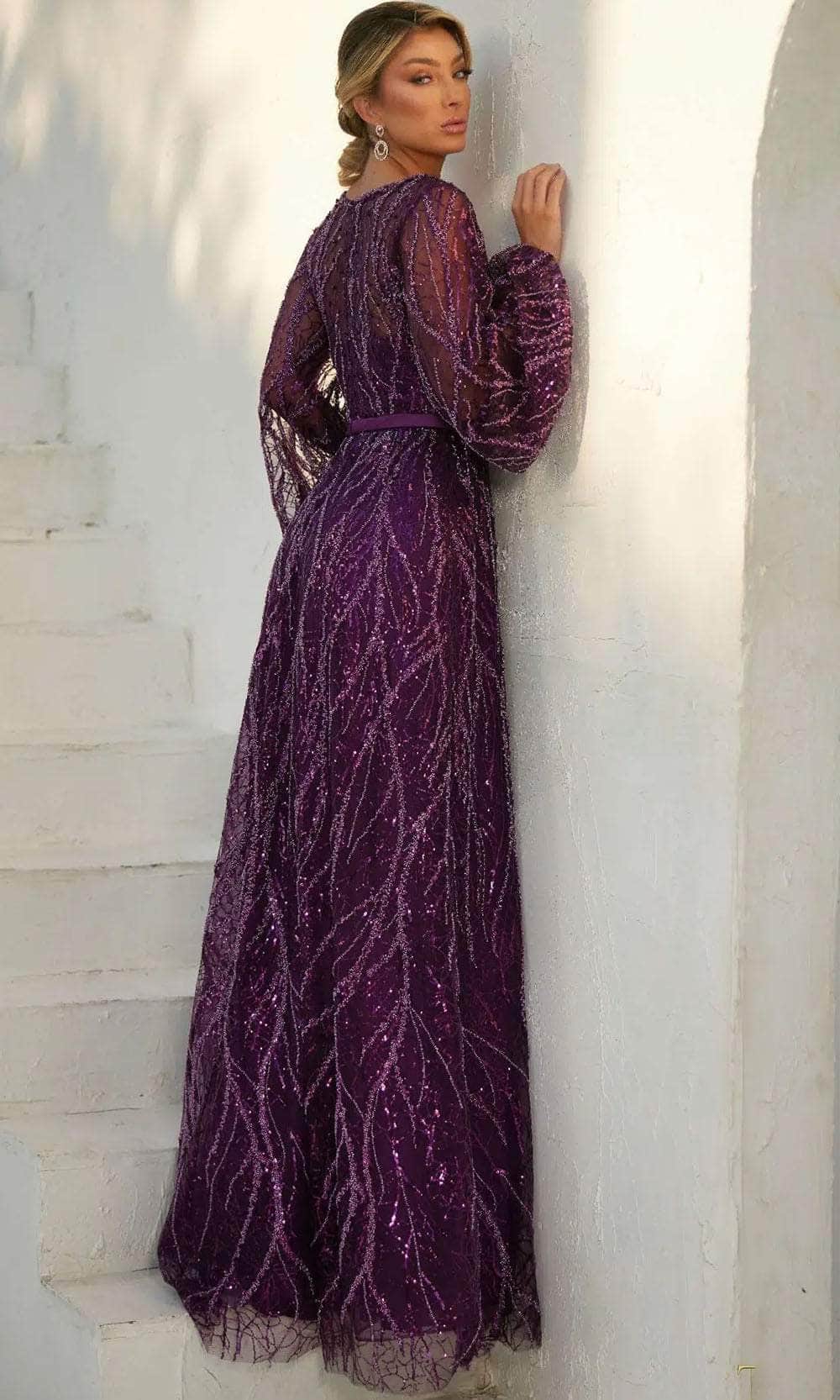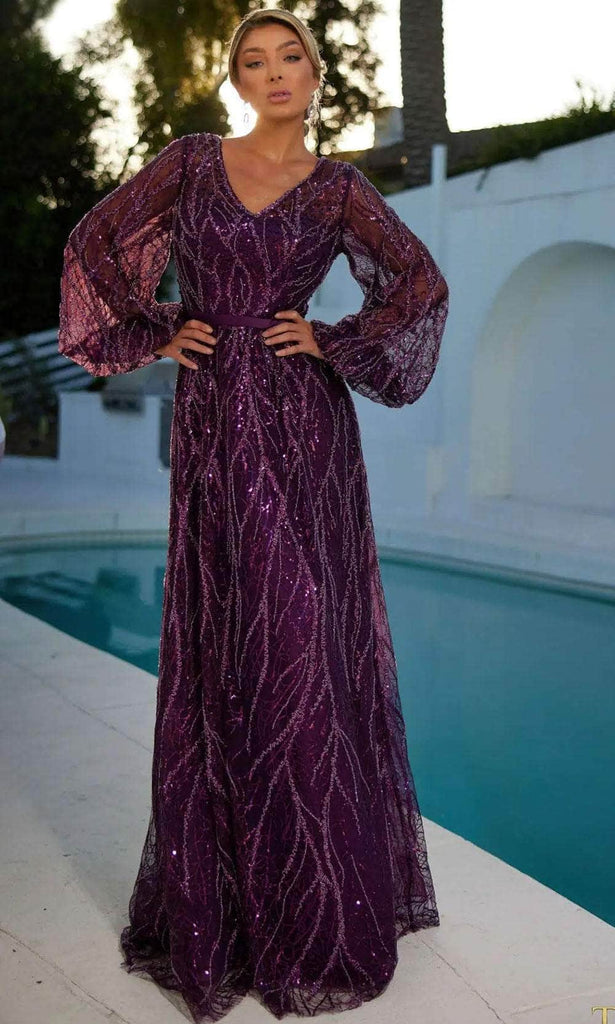 Command the spotlight in the Terani Couture 241M2739, a vision of elegance and grace. This gown is the epitome of timeless beauty and modern chic, designed to make you shine on any special occasion. The A-Line silhouette offers a flattering and graceful look, allowing you to move with ease and radiate confidence. The V-neck and long sleeves add a touch of sophistication and style, while the delicate lace on the tulle creates a romantic and ethereal effect. Embrace a night of enchantment in this captivating Terani Couture 241M2739 ensemble. Models are wearing Eggplant and Navy colors.