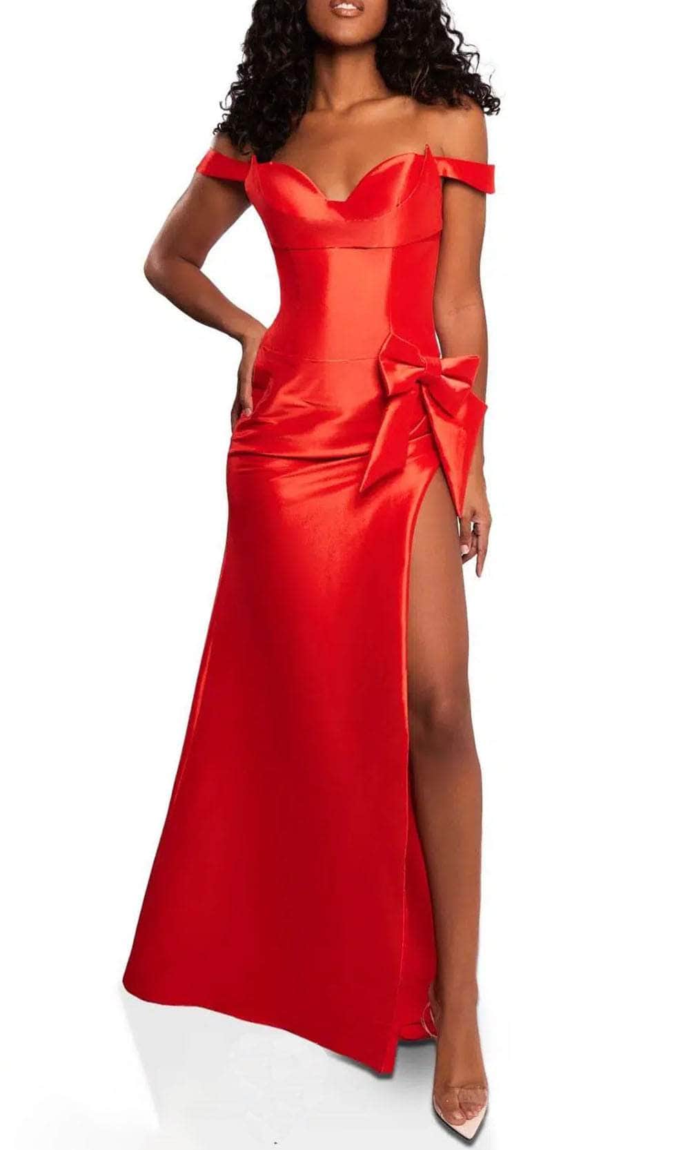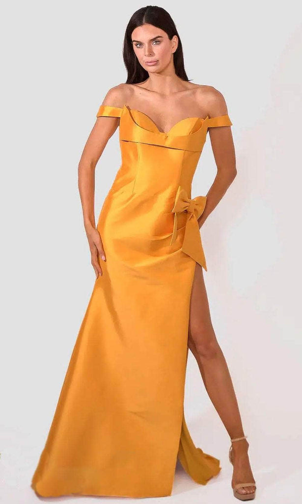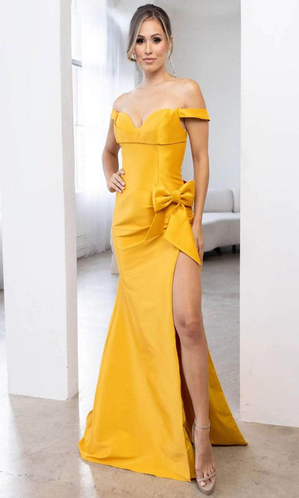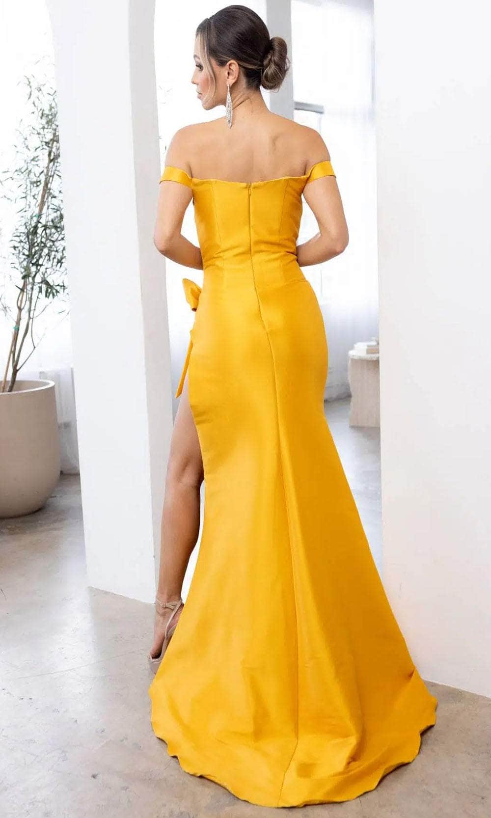 | Details: | Off-Shoulder, Seams, Bow Accented, Fitted Bodice, Slit, Train, Back Zipper Closure |