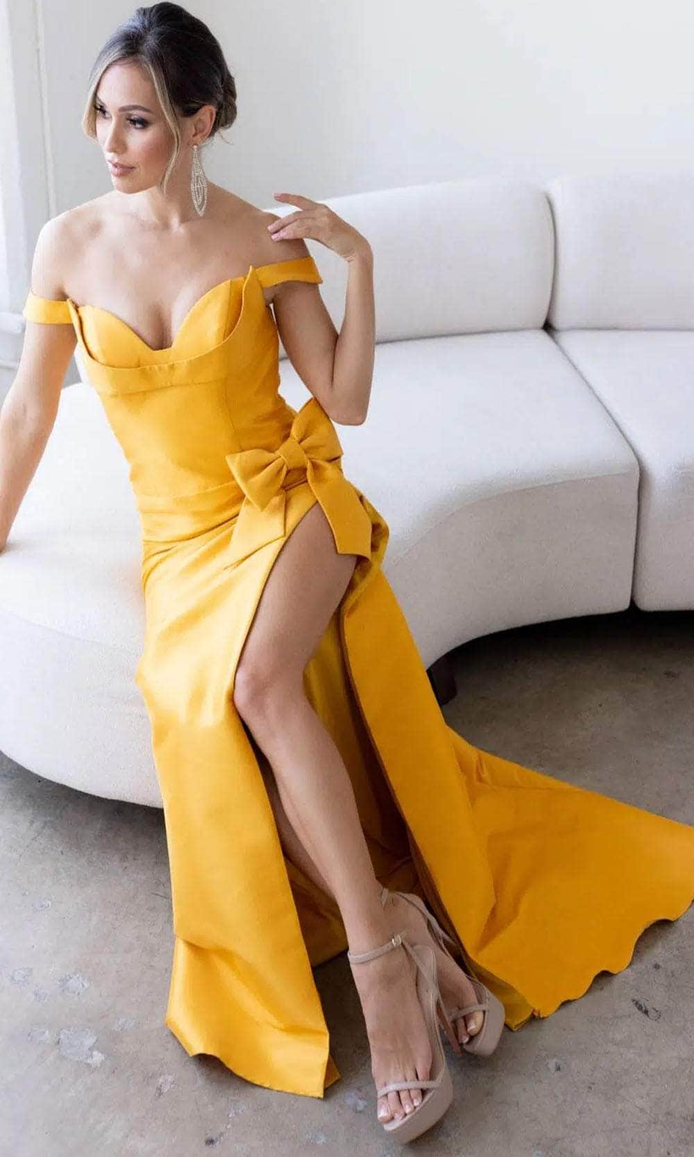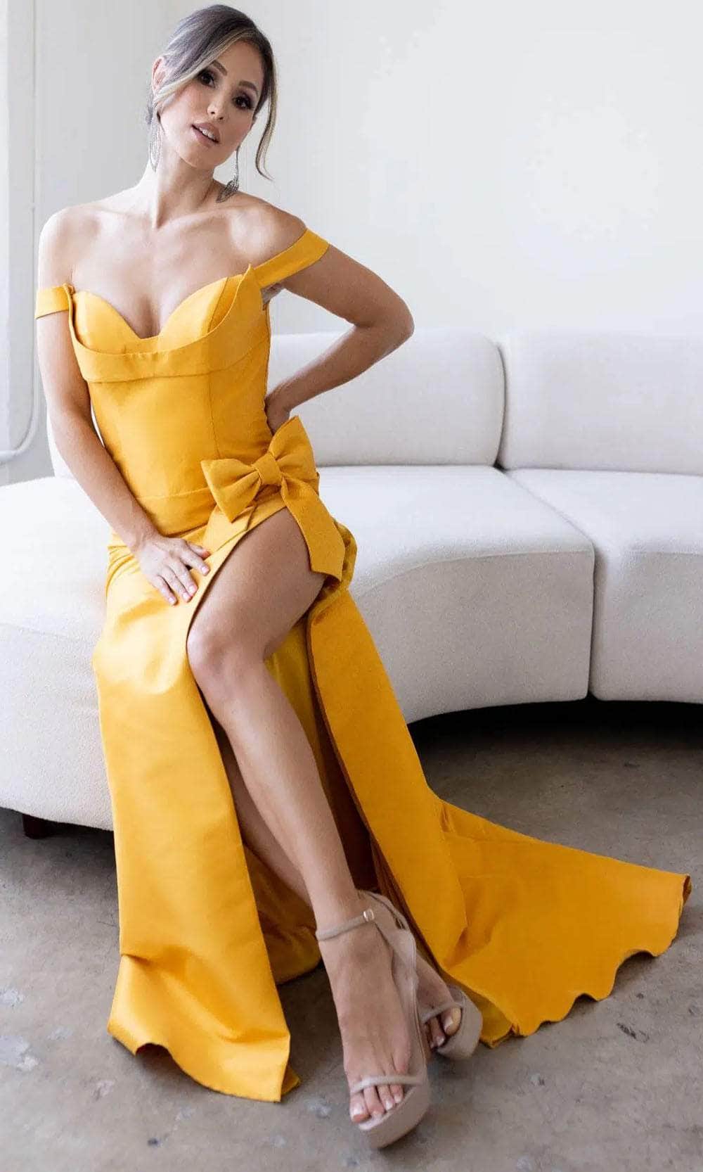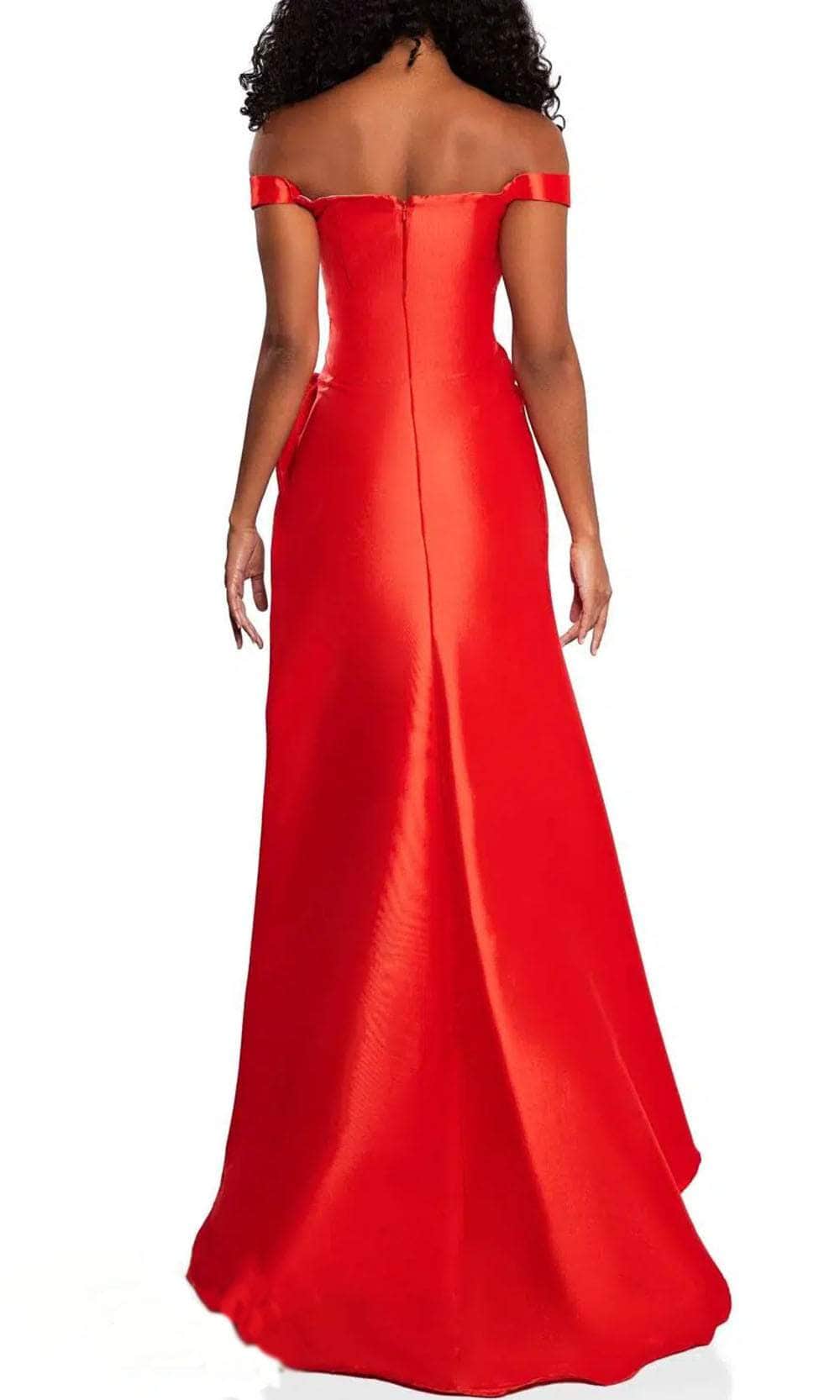 | Details: | Off-Shoulder, Seams, Bow Accented, Fitted Bodice, Slit, Train, Back Zipper Closure |