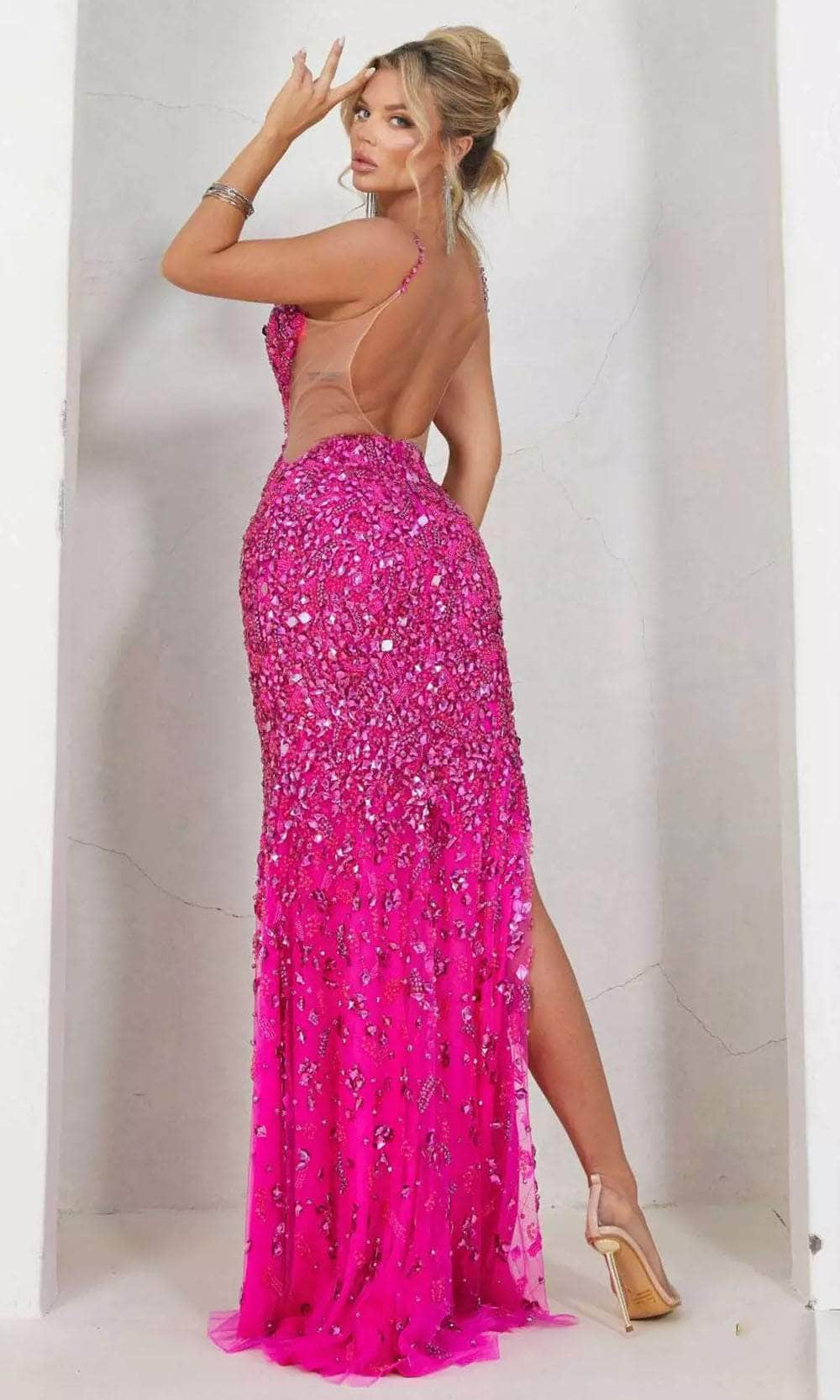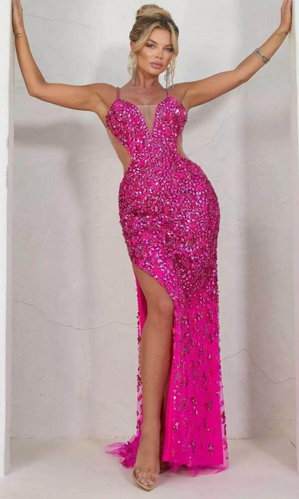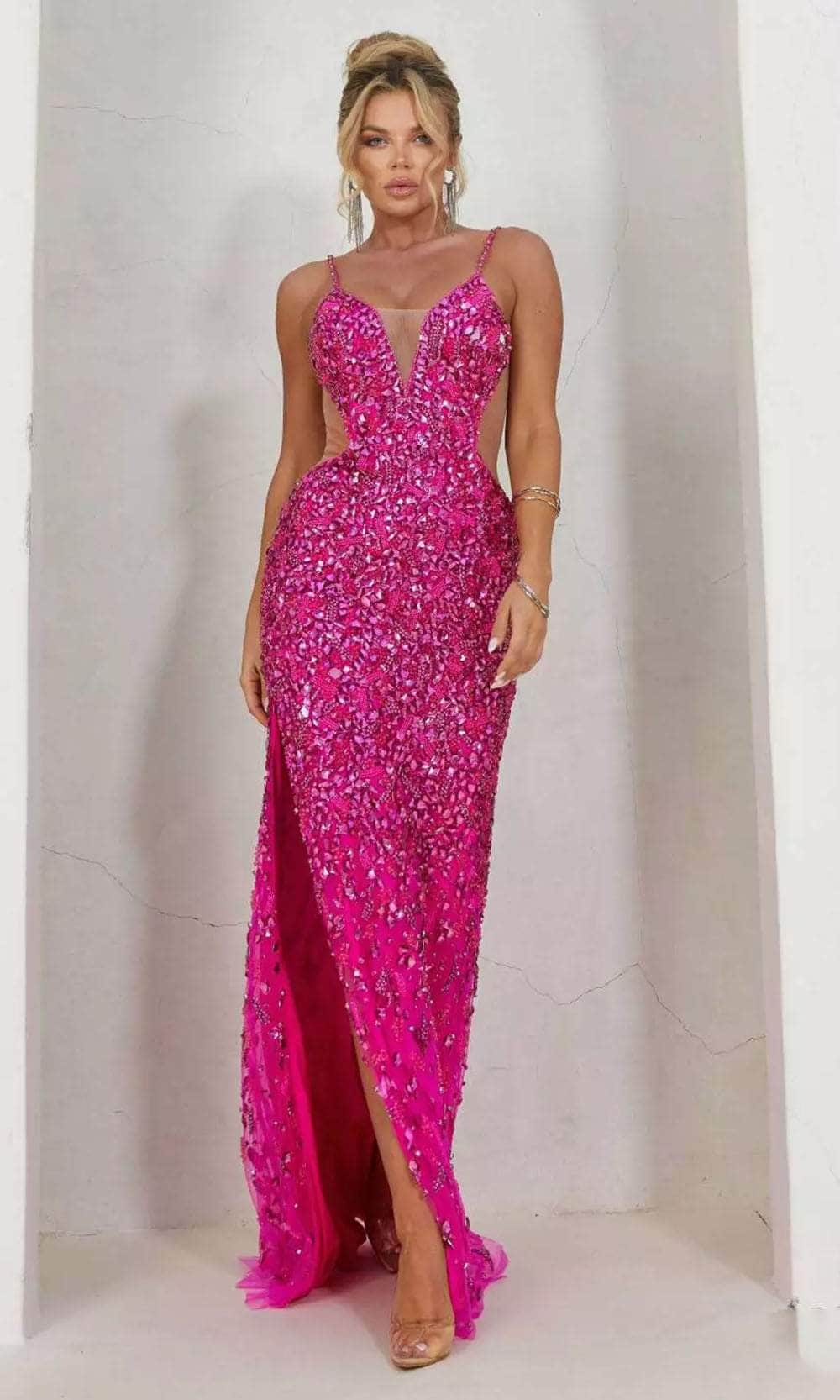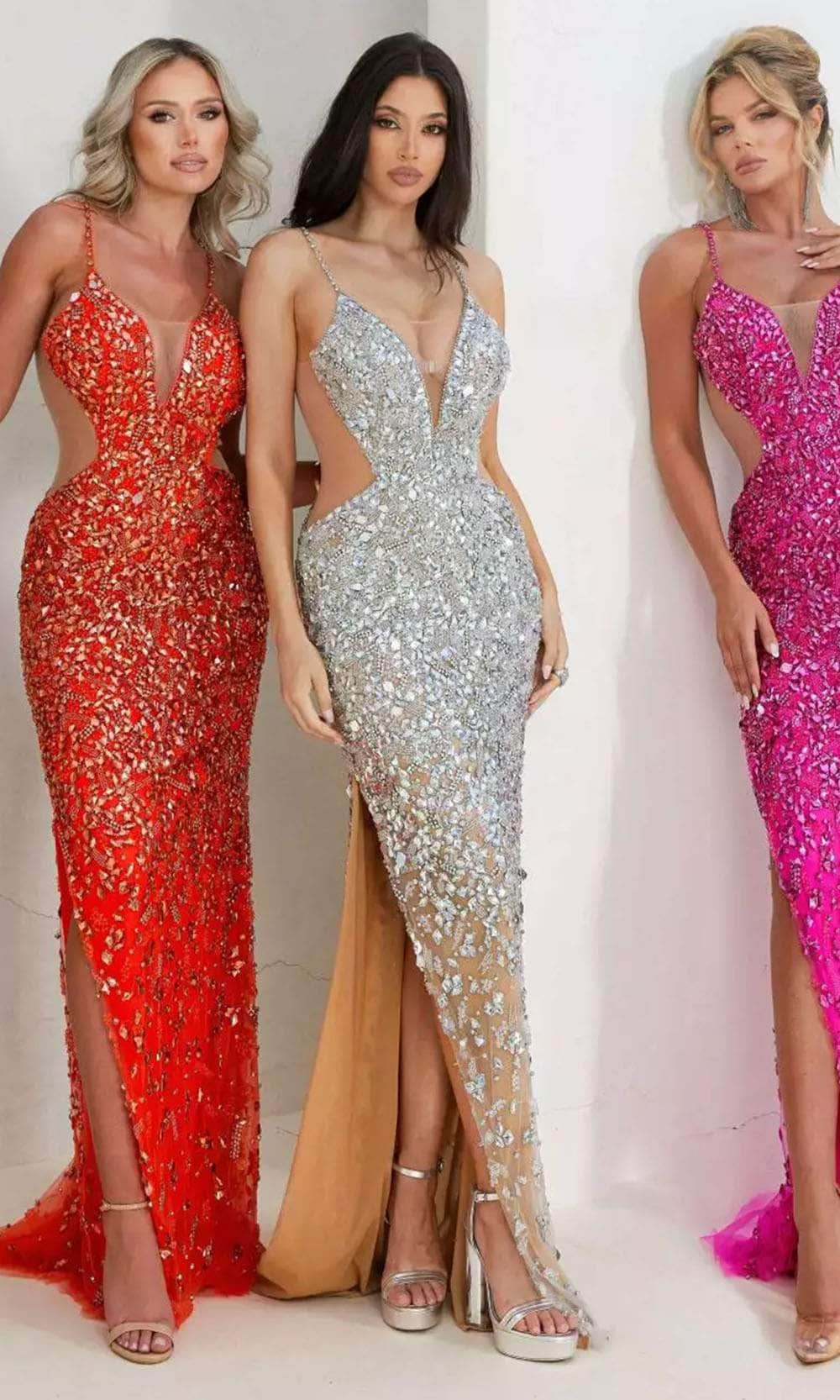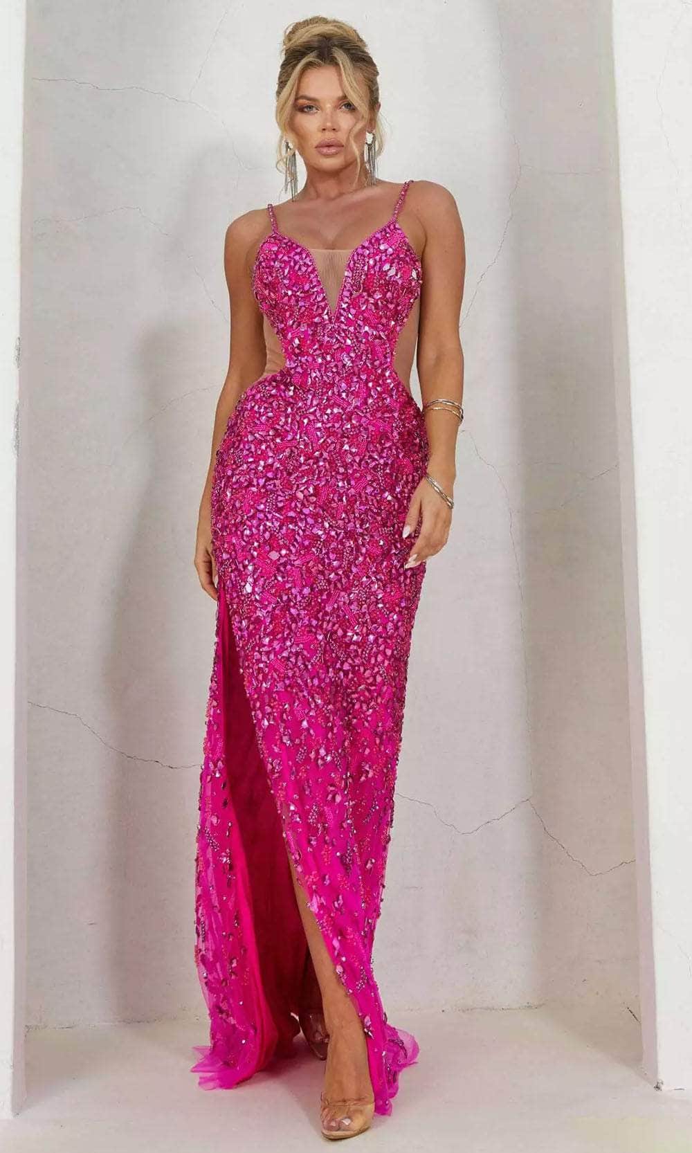 Exude beauty and grace wearing Terani Couture 241P2163 prom dress. This dress showcases a plunging sweetheart neckline supported spaghetti straps in a fitted and sleeveless bodice. It also displays sheer inset and sheer side cut-outs. You will never look boring with its rhinestone and cut glass embellishments all over the attire. The slit has a sheath silhouette with slit gracing down to its full-length while the back shows an open back with back zipper closure. Terani Couture 241P2163 creation is perfect for your next event. Models are wearing Crystal Silver Nude, Magenta Fuchsia, and Orange colors.