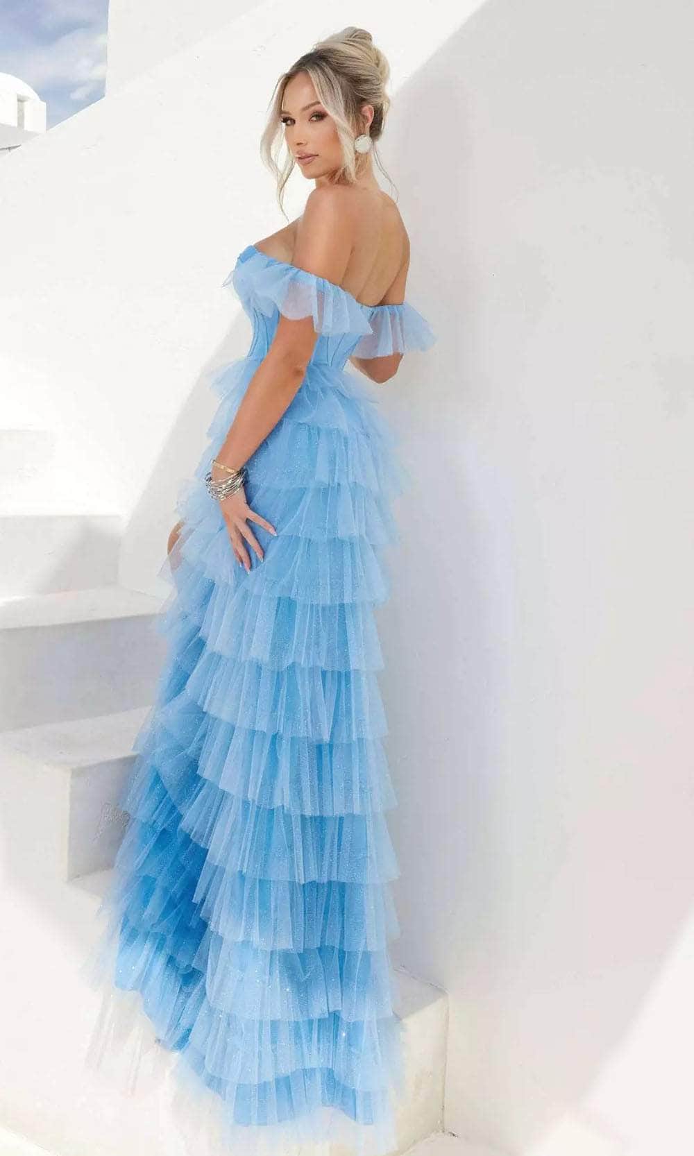 Walk in a defined sophistication and beauty wearing this Terani Couture 241P2211 prom dress. This dress features a fitted, corset-style bodice with an off-the-shoulder neckline. The glittery skirt with layers of ruffle designs will make you look more amazing and fun. It will also draw your attention to the slit that runs the length of this A-line silhouette skirt. The back features mid-open back enclosed by a back zipper as well as a sweep train. Start your night out right with a stylish Terani Couture 241P2211 creation. Model is wearing Denim color.
