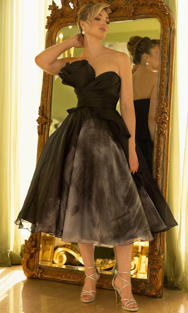 Dazzle and shine in the Terani Couture 242C3011 dress. This show-stopping piece features a classic ballgown silhouette with a contemporary twist—playful short length. The sweetheart neckline flatters your curves, while the strapless design adds sophistication and allure. Made from luxurious matte satin fabric, it offers a smooth, polished look that reflects light beautifully. The bold combination of silver and black creates an unforgettable statement. A back zipper closure ensures a secure fit, Terani Couture 242C3011 perfect for dancing the night away. Model is wearing Silver Black color.