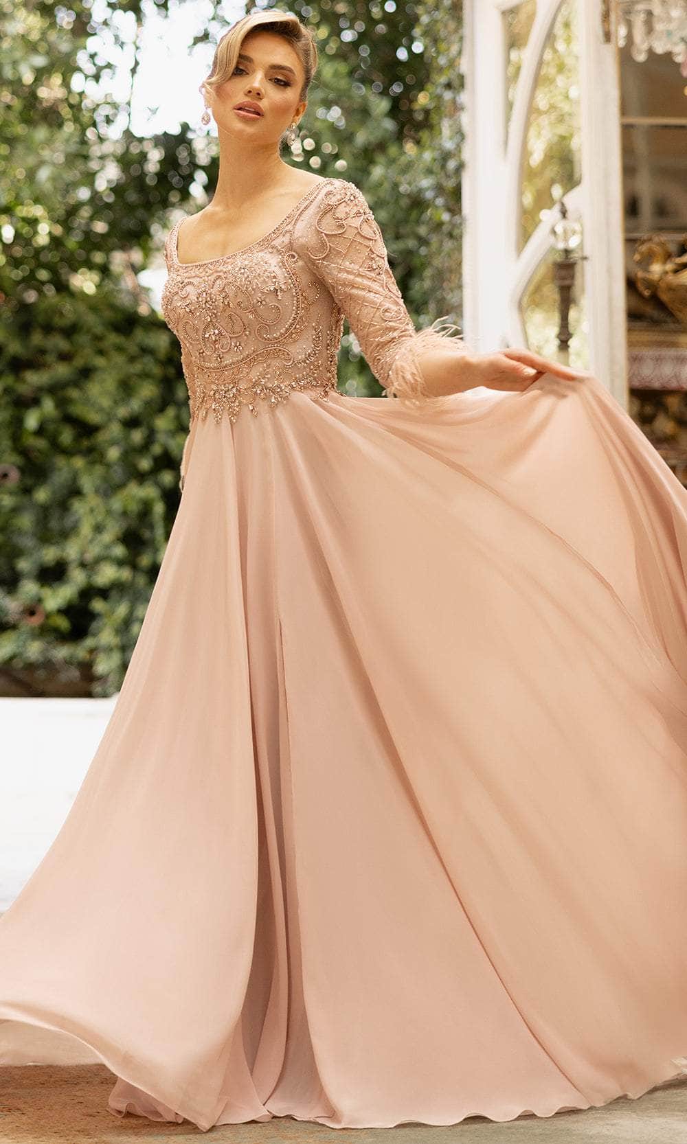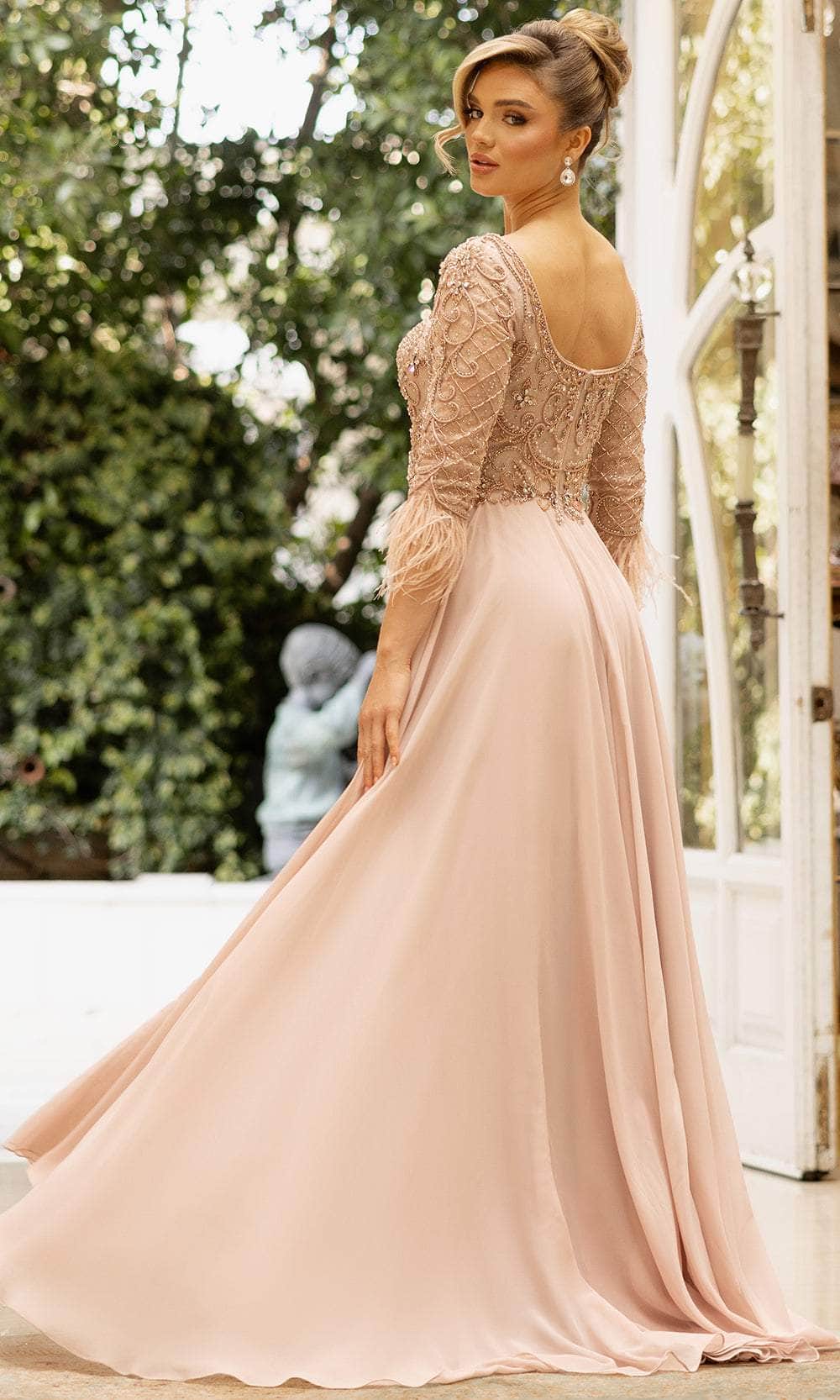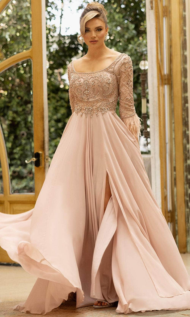 Attain the ideal combination of elegance and fashion in this Terani Couture 242M3390. This dress has a sweeping, floor-length A-Line silhouette, a delicate scoop neckline, and 3/4 sleeves made of gorgeous, lightweight chiffon fabric. It has a hook and eye zipper closing at the back for a safe and cozy fit. Whether you are attending an official ceremony, wedding, or other special occasion, this 3/4 sleeves scoop dress will create a memorable impression. Do not wait, add this lovely dress to your closet today and make a statement at your next event Attract interest with this Terani Couture 242M3386 Mikado Off-Shoulder Long A-Line Dress, ideal for nighttime elegance. This stunning gown boasts a lavish, floor 242M3390 silhouette crafted from luxurious Mikado fabric. The off-shoulder sleeves add romance, while the straight neckline exudes sophistication. The subtle sheen of the fabric catches the light with every move, making the Terani Couture 242M3386 perfect for weddings, galas, and formal occasions. Model is wearing Blush color.