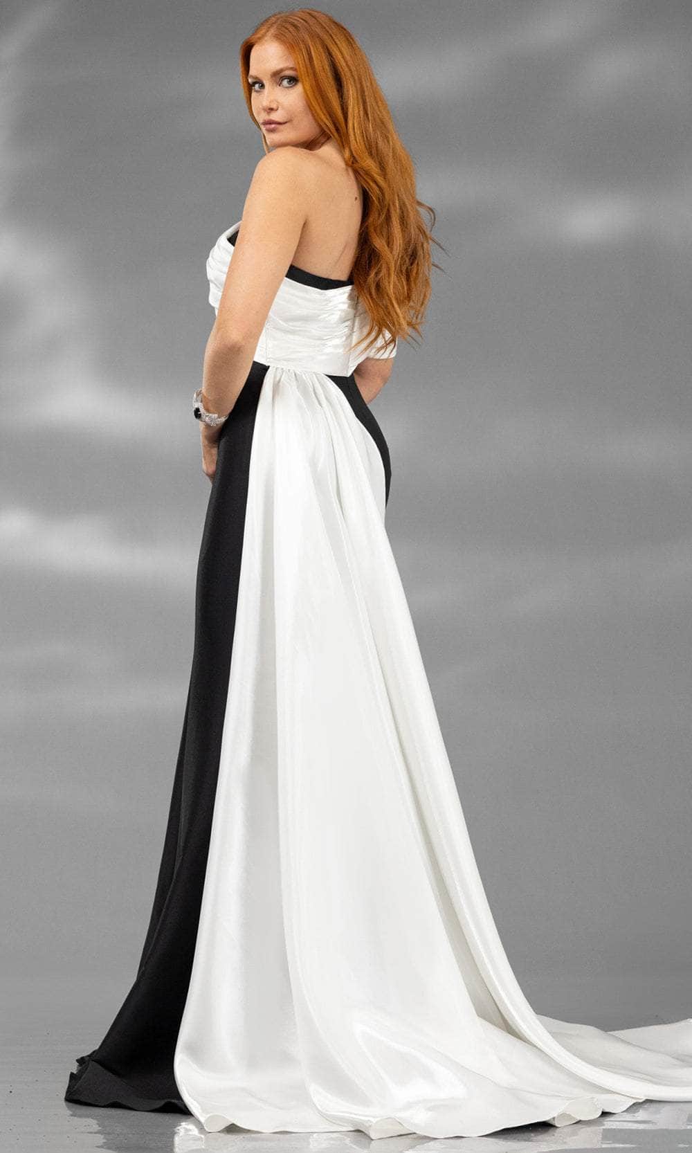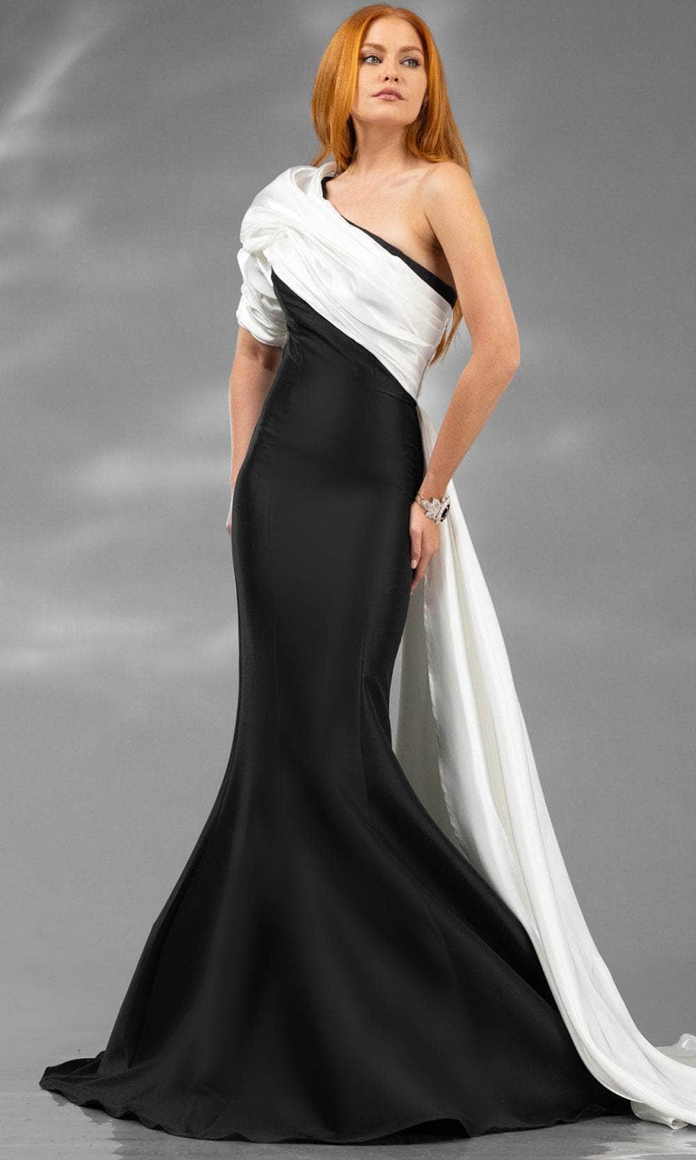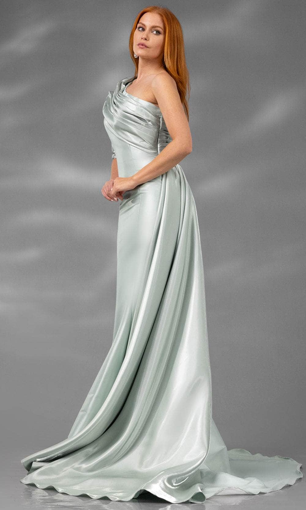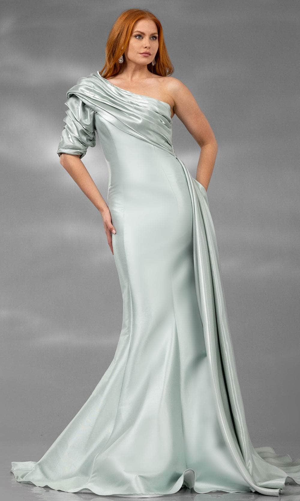 Look jaw dropping in this regal creation from Terani Couture 251E4205. Fashionably detailed with ruching, the gown exhibits an enthralling asymmetric neckline and short sleeve on one shoulder. A mid-open cut in the back allows for a captivating glimpse of skin and is secured by a hidden zipper. Sculpted with flattering seams, the skirt forms a statuesque mermaid silhouette. The addition of a side overskirt and sweep train offers a pure grandeur finish. Steal the show in this magnificent Terani Couture 251E4205 gown. Models are wearing Black White, Emerald, and Sage colors.