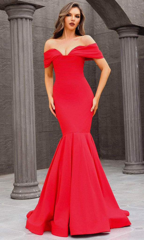 Envision an evening of refined elegance and grace at your black-tie event in this Terani Couture 251E4271 masterpiece. Made from stretch taffeta fabric, the outfit is simple yet fashionable. Bringing a romantic appeal, the sweetheart neckline also highlights your collarbones. The draped off-shoulder sleeves and mid-open zippered back are additional features. In a mermaid silhouette, the skirt beautifully defines your hourglass curves and has box pleats that lend volume and structure. This Terani Couture 251E4271 masterpiece is designed for prom, pageant nights, or black-tie occasions. Model is wearing Red color.