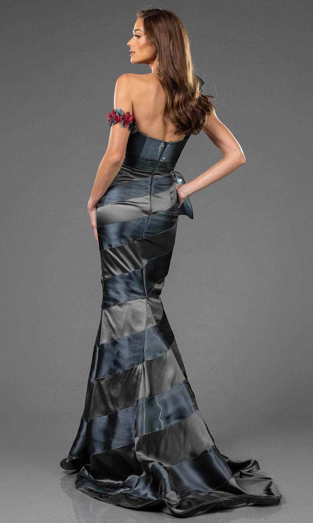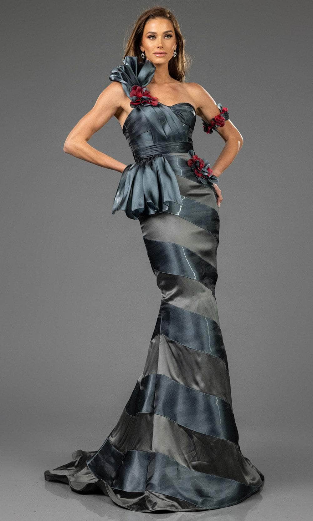 Make a striking impression with the Terani Couture 251E4284 evening gown, a masterpiece designed to make unforgettable impressions at any formal event. This captivating Slate-colored gown is crafted from luxurious fabrics that offer both elegance and comfort. The asymmetrical neckline adds a modern twist to the classic trumpet silhouette, while the sleeveless design enhances the fitted bodice for a sleek, refined look. The skirt flares dramatically from the knee, creating a sweeping, glamorous effect perfect for black-tie affairs, weddings, or galas. Featuring a secure hook-and-eye and zipper closure at the back, this gown promises a flawless fit, ensuring you shine from every angle. Embrace the elegance and make a statement in this stunning gown. Model is wearing Slate color.