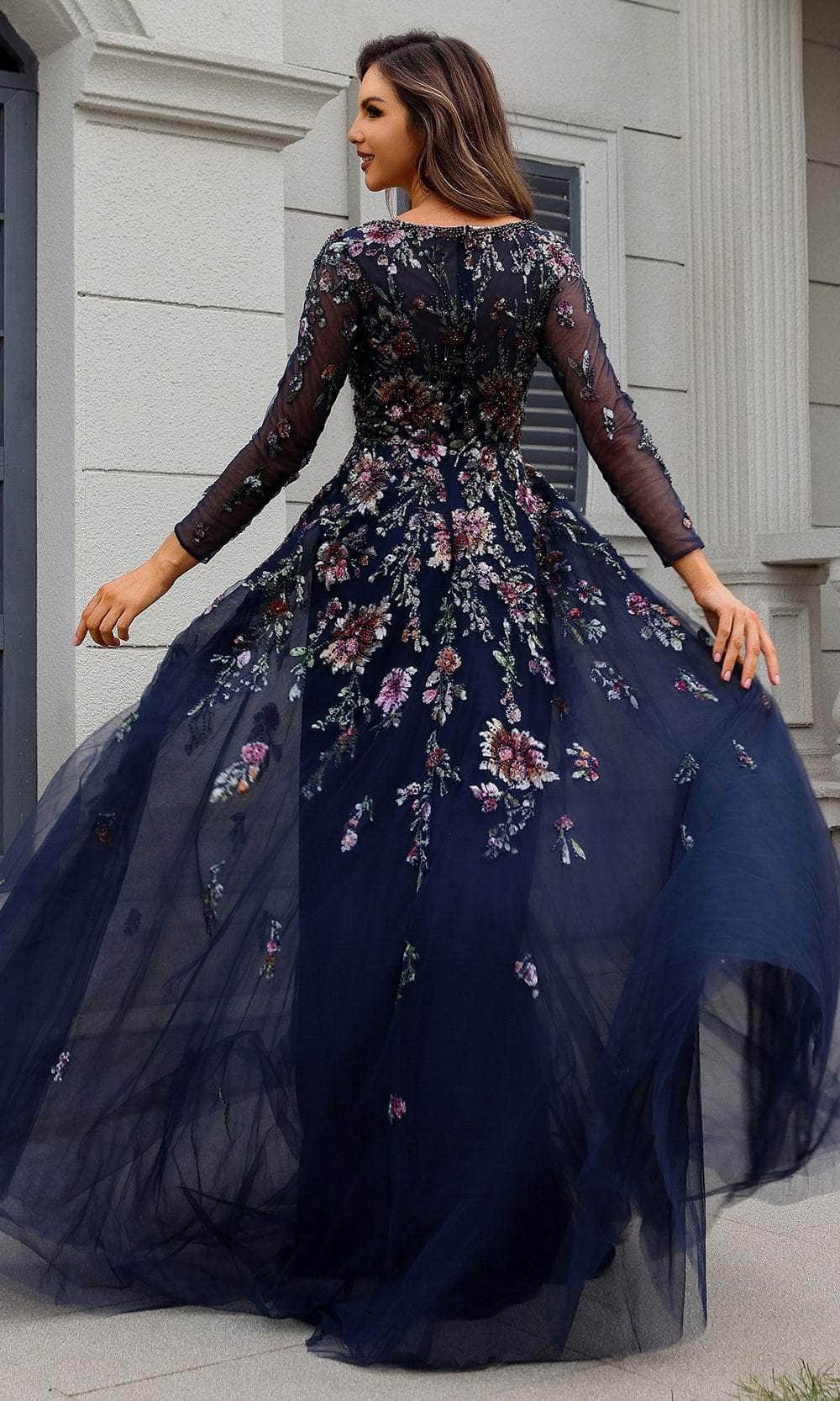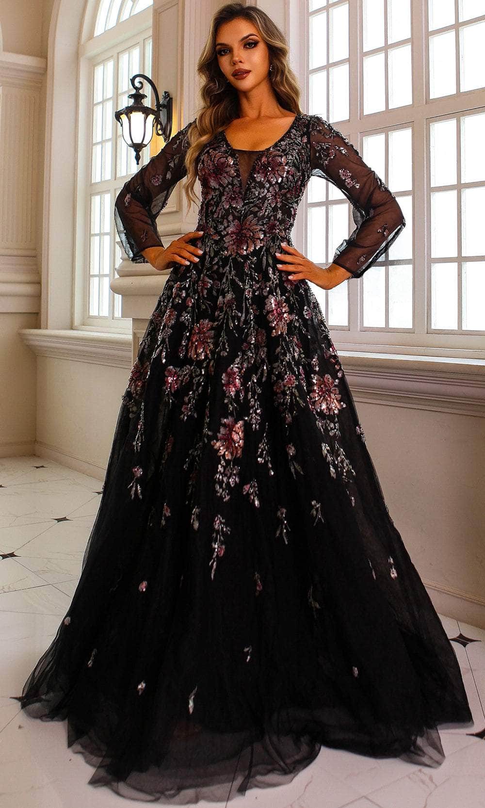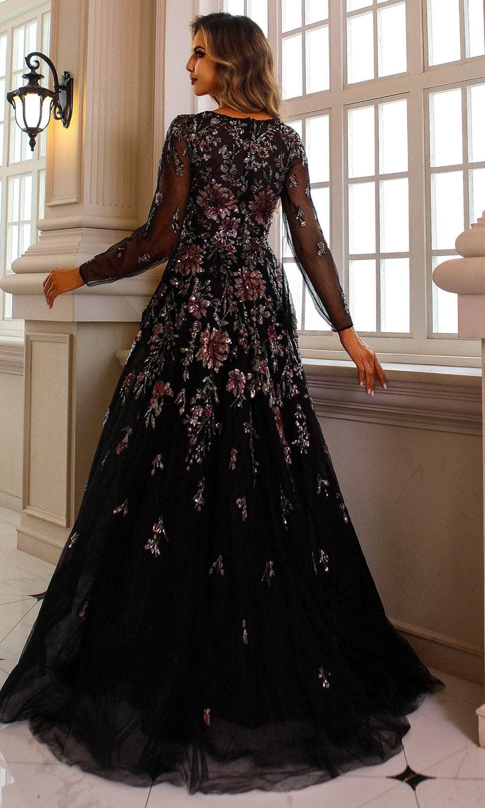 Sheer Long Sleeves, Floral Sequin, Beaded, Full Back, Concealed Zipper Closure, Sweep Train |