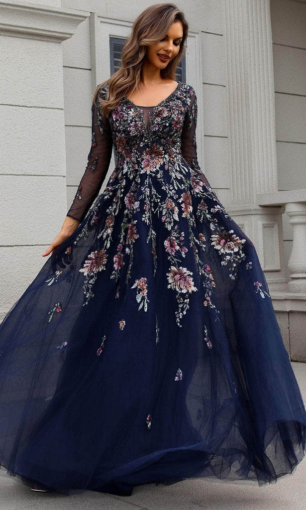 Showcase your inner royalty with the Terani Couture 251M4408, a gown designed for elegance and grandeur. Lavished with floral sequins and beadwork on soft tulle, this dress dazzles under the lights. The plunging V-neckline with a sheer inset offers subtle allure, while sheer long sleeves provide graceful coverage. A Basque waist leads to a voluminous ballgown skirt with a sweeping train. Ideal for high-profile events, this gown will ensure all eyes are on you as you walk into the room.