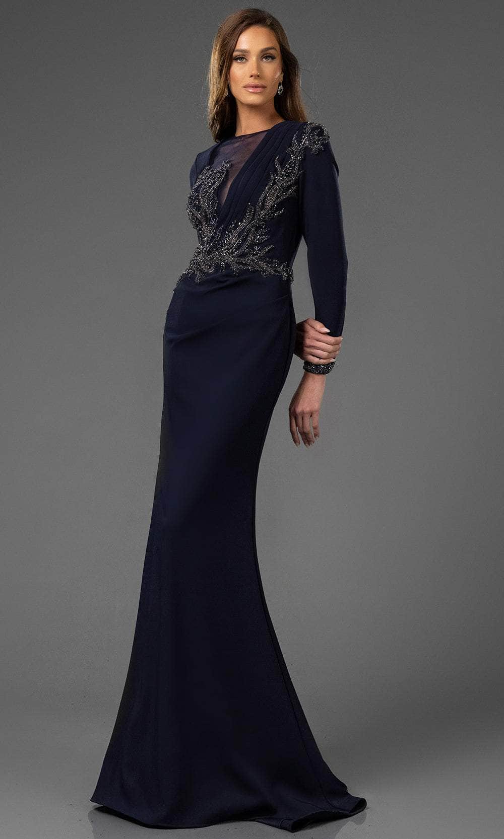 Celebrate that queenly feminine beauty by wearing this Terani Couture 251M4422 masterpiece. The gown captivates with an illusion jewel neckline, perfectly complementing the beaded appliques and pleats that adorn the top bodice. Long sleeves and a fully covered back add sophistication. The sheath silhouette of the skirt captures attention as it glides down to the floor and sweeping denouement. This Terani Couture 251M4422 creation is simply perfect for your next party. Models are wearing Dusty Rose, and Navy colors.