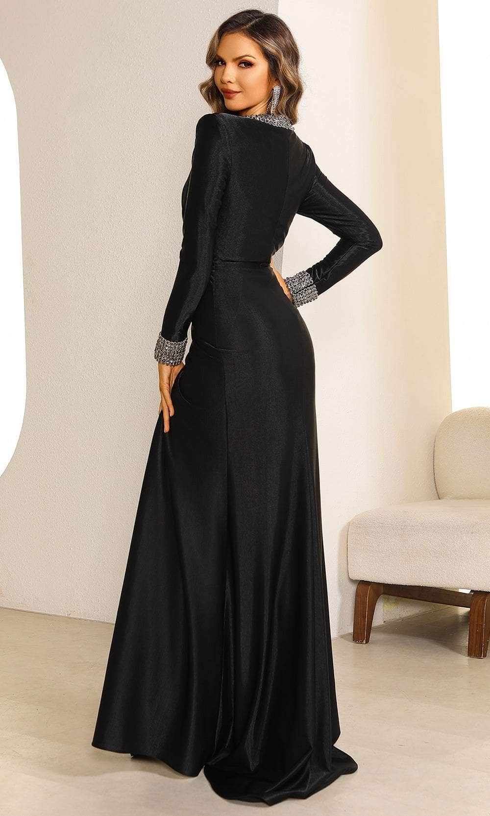 Walk through your evening event with classiness and poise in the Terani Couture 251M4433. Designed to sculpt your flawless figure, the dress has an artful ruched draping detail. The jewel neckline and long-sleeved cuffs are festooned with sparkly beads for subtle luxury. A hidden zipper fastens the full back, ensuring a comfy fit. The wrap skirt unveils a form-fitting sheath silhouette with a thigh-high leg slit and sweeping train for an unforgettable look. This Terani Couture 251M4433 masterpiece brings a striking look meant to turn heads. Models are wearing Black, and Powder Blue colors.