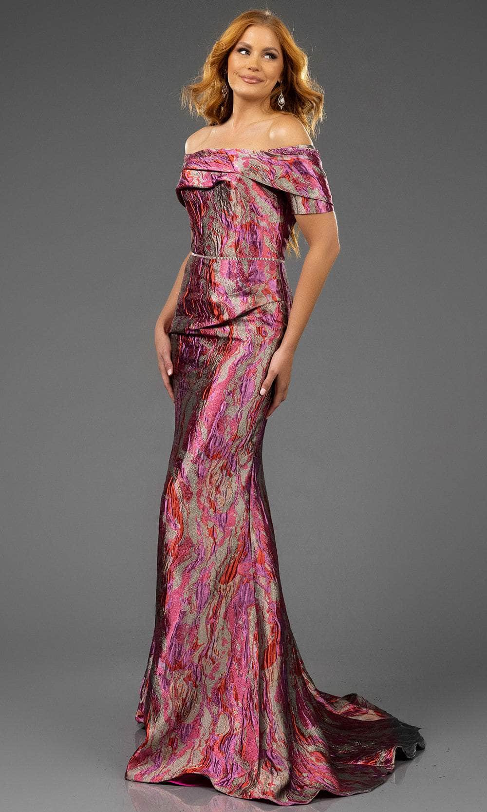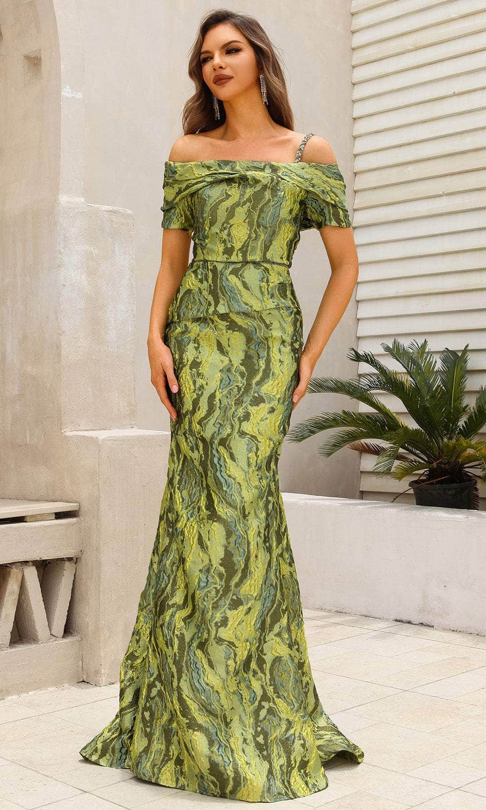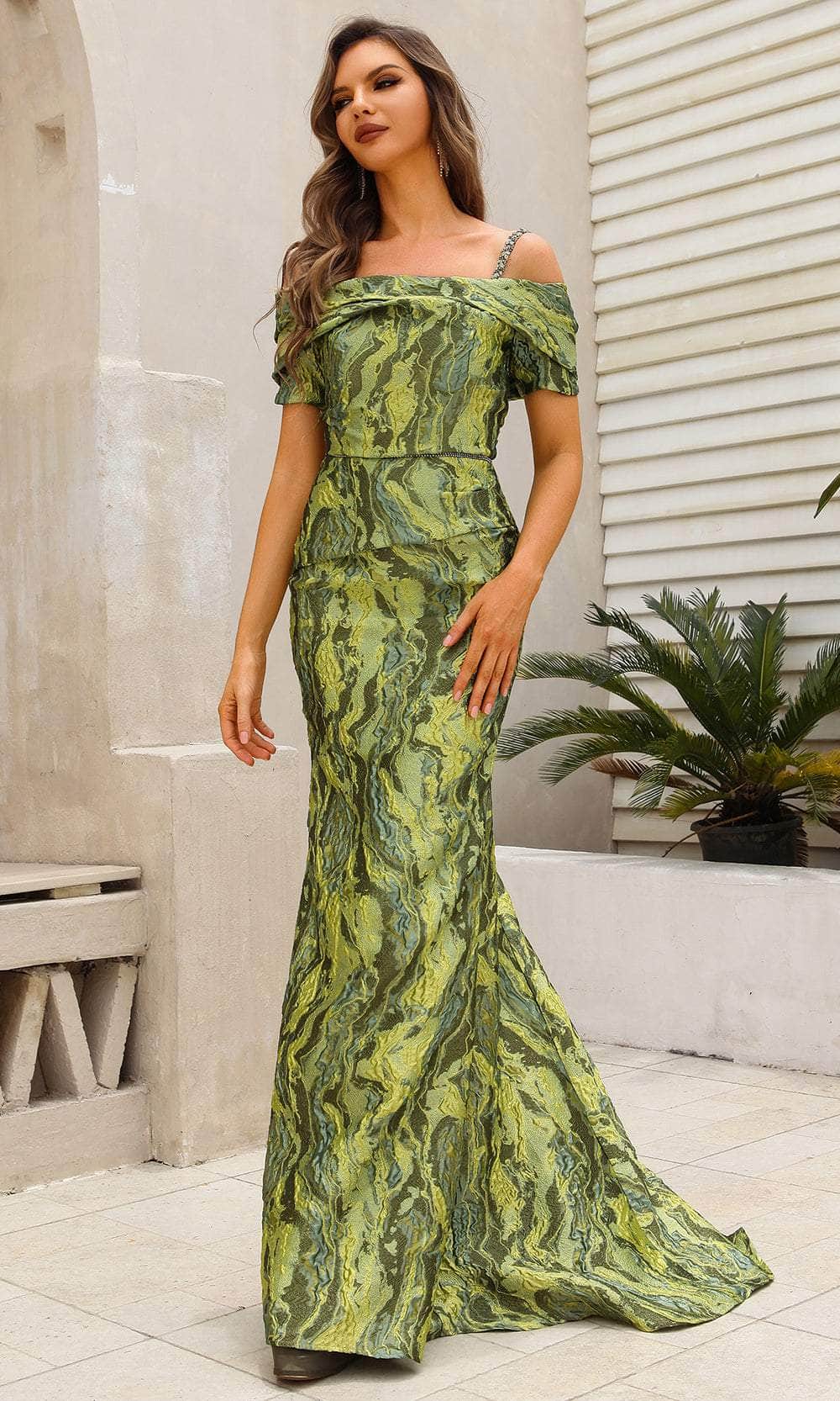 All eyes will undoubtedly be on you when you wear this Terani Couture 251M4434 masterpiece. Lavishly molded from a lava jacquard fabric with ruching, this outfit highlights the fold-over detailing in the straight off-shoulder neckline. Additionally, the short sleeves and mid-open back exudes modest elegance. The skirt flares down to the sweeping train and creates an elegant sheath silhouette. Look absolutely fabulous for your evening affair in this Terani Couture 251M4434 long dress. Models are wearing Green, and Fuchsia colors.