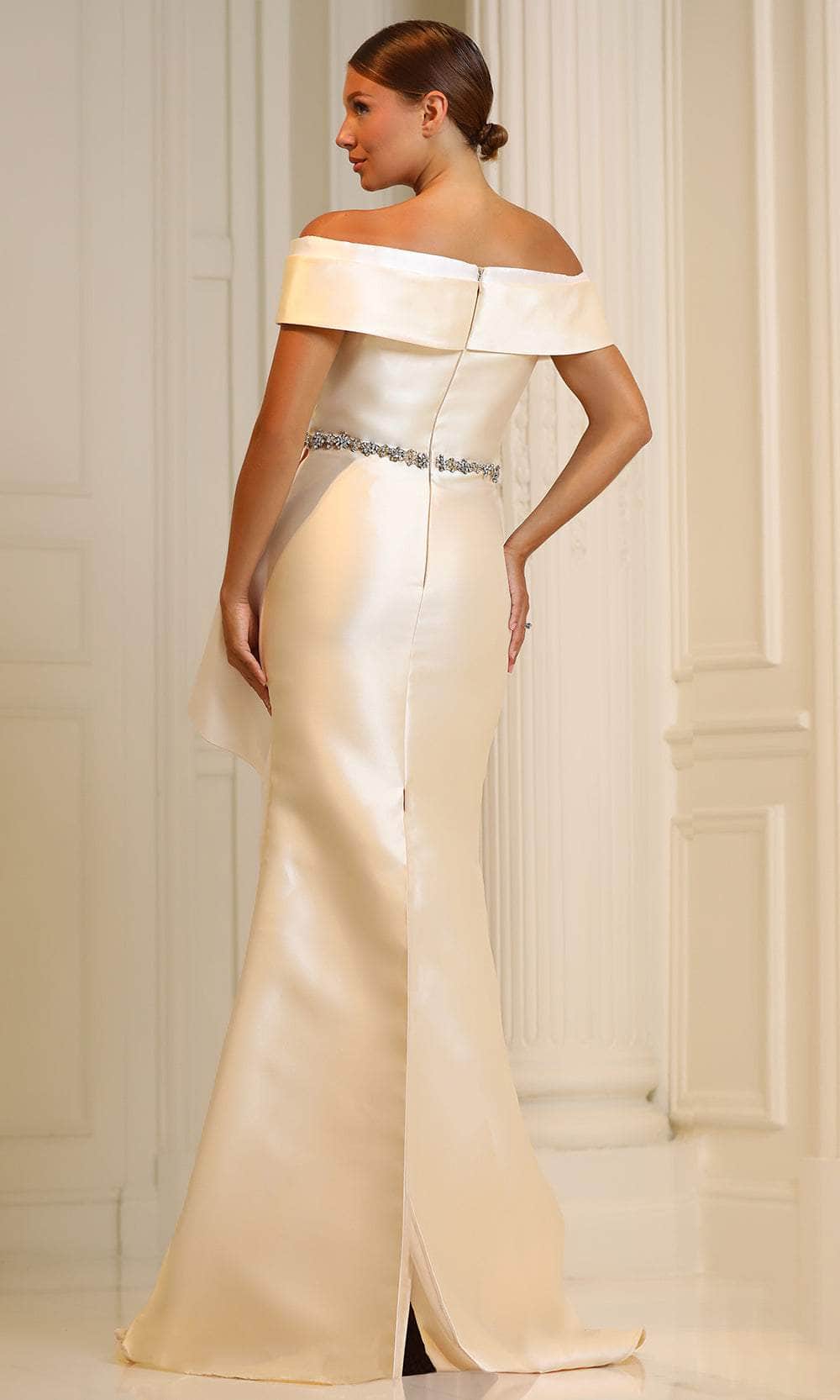 Exhibit a remarkable and glamorous appeal in the Terani Couture 251M4452 design. The Mikado ensemble features exquisite short sleeves and an off-shoulder neckline with graceful fold-over detailing. The ruffle design in the peplum brings a playful flair. Graced with a crystal beaded thin belt, the skirt skims into a full-length sheath silhouette with a center-back slit for ease of movement. Go beyond beauty in a Terani Couture 251M4452 masterpiece. Models are wearing Taupe Silver, Champagne Ivory, and Denim Blue colors.