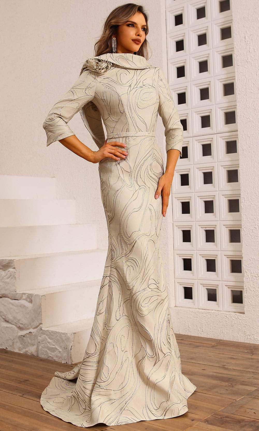 Make a remarkable entrance while wearing this regal Terani Couture 251M4455 creation. The attention-grabbing dress showcases a beautifully tailored bodice made of luxurious jacquard fabric. It begins with a bateau neckline and graceful quarter-length sleeves. Mid-open and zipper closure are captivating displays on the back. A 3D floral accent blooms on one shoulder, while the thin waistband and shawl style adds a modern twist. The sweep train and sheath skirt complete the look. Bring on the glam in this Terani Couture 251M4455 masterpiece. Model is wearing Champagne color.