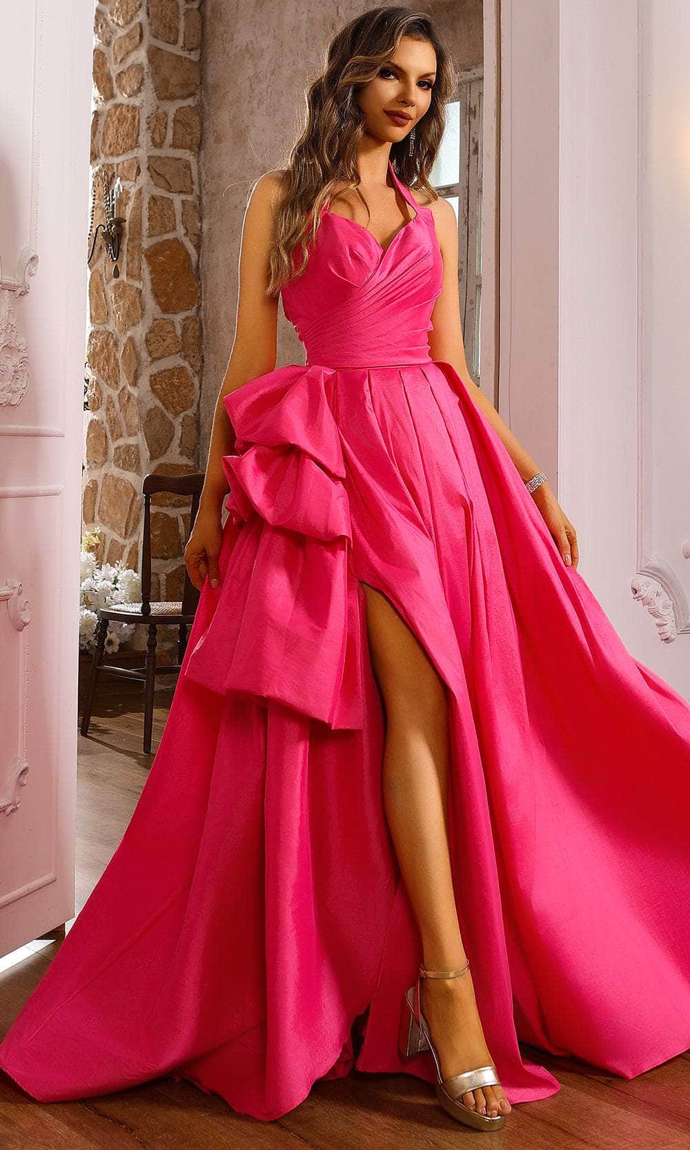 Turn heads and live out your fantasy of being the most beautiful at the prom in this Terani Couture 251P4058 gown. The ensemble is made from luxurious stretch taffeta, displaying a sweetheart bodice and halter neckline that sets the stage for elegance. Pleated details and a ruffle drape at the side waist enhance the drama. The backless cut and thigh-high slit subtly expose a glimpse of your skin. Falling to a floor-length hem, the skirt forms a voluminous ballgown silhouette that hugs all shapes. This Terani Couture 251P4058 masterpiece will undeniably make you feel special. Models are wearing Lemon, and Coral Pink colors.