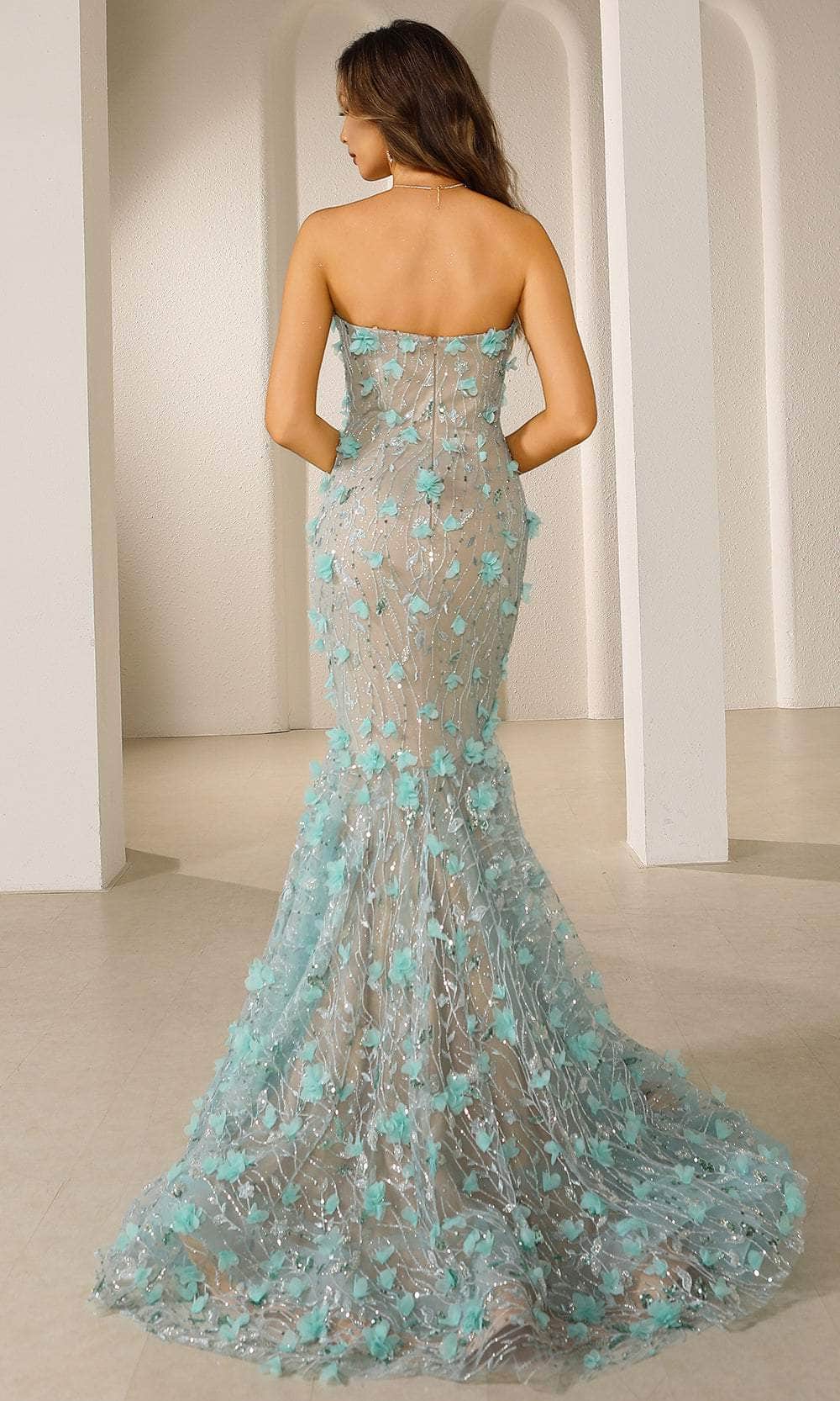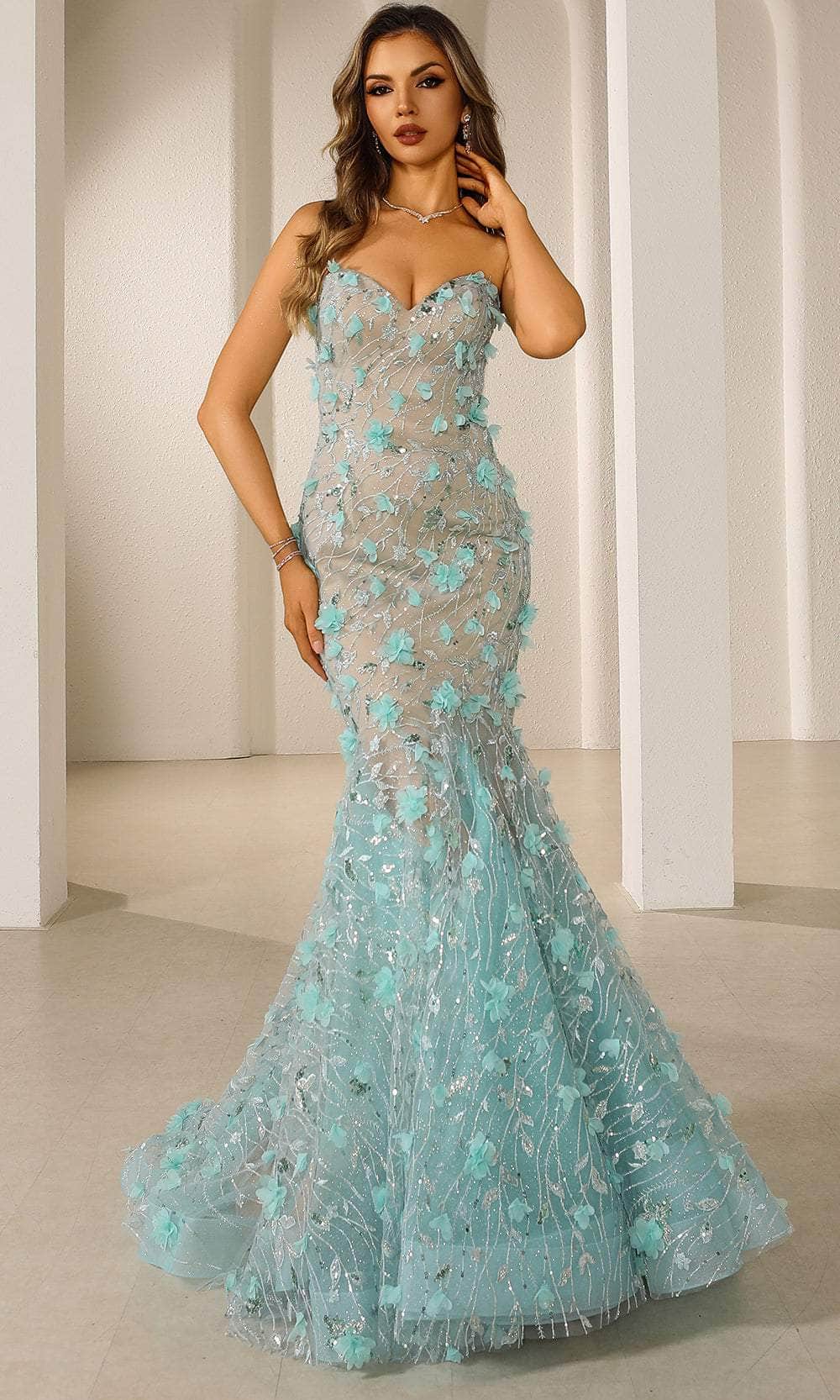 Drop jaws when the people at the party sees you in this Terani Couture 251P4379 sweetheart trumpet dress, perfect for prom or any grand occasion. This mesmerizing gown features a strapless design that elegantly frames your shoulders and collarbone, adding a touch of sophistication. The luxurious tulle fabric hugs your curves, creating a striking trumpet silhouette that flares out beautifully as you move. The sweetheart neckline enhances your femininity, giving you a timeless, graceful look. Secured with a back zipper and hook-and-eye closure, this dress ensures a perfect and effortless fit. Shine bright and make unforgettable memories by stepping into this stunning Terani Couture 251P4379 and captivating everyone around you. Model is wearing Aqua color.
