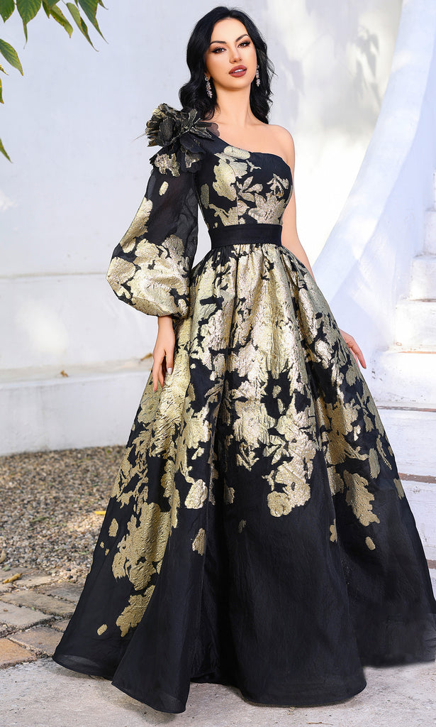 | Details: | One Shoulder, Floral Pattern, Long Bishop Sleeve, Oversized Floral Accent, Wide Waistband, Floor Length |