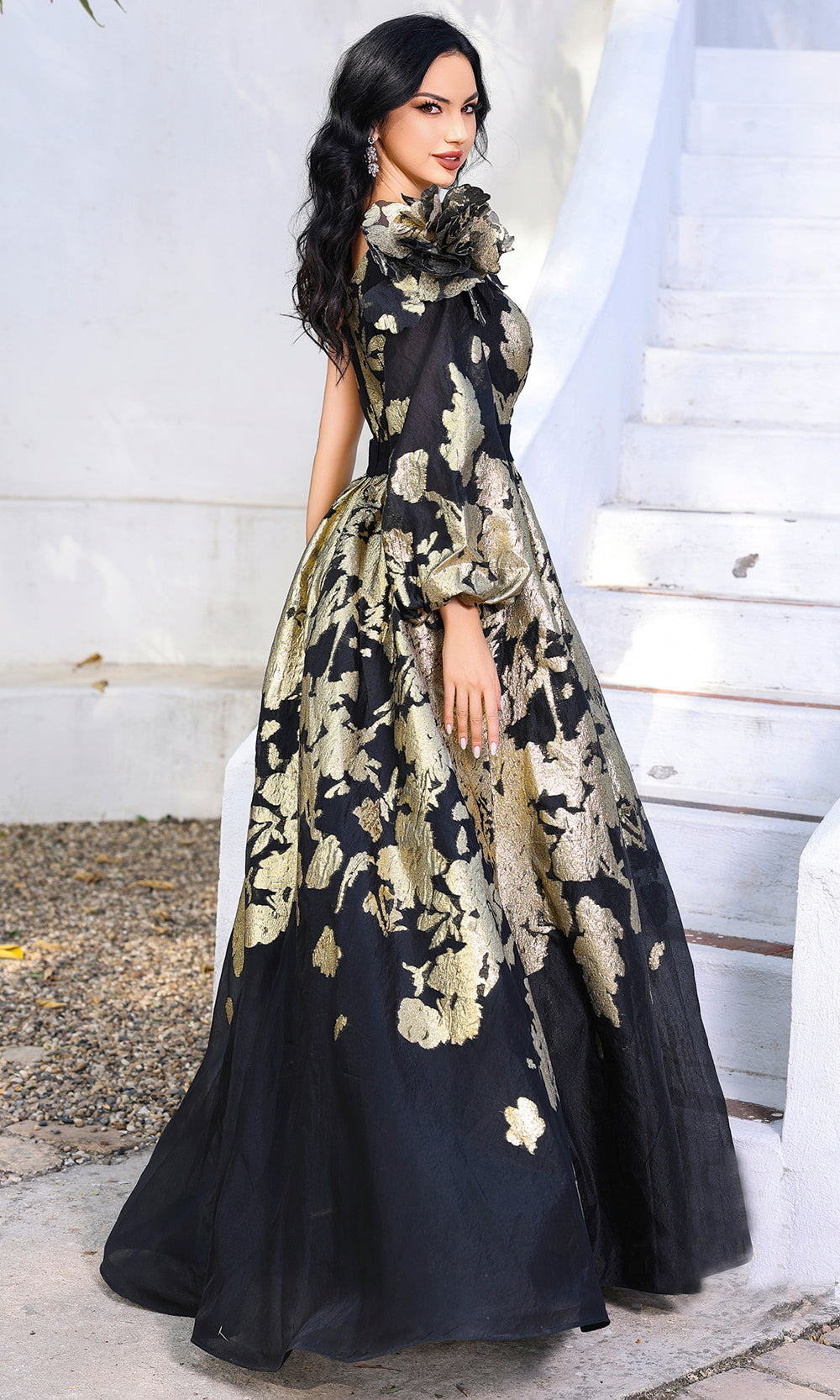 Command attention in the Terani Couture 252E5140, a gown that embodies dramatic elegance and artistry. The asymmetric neckline is paired with a voluminous bishop sleeve, creating a statement-making design. An oversized floral accent at the shoulder brings couture flair, while the floral metallic jacquard fabric flows into a grand ballgown silhouette that moves with captivating grace. With its thoughtful construction and exquisite detailing, the Terani Couture 252E5140 delivers sophistication, confidence, and unforgettable charm in every step taken. Model is wearing Black Gold color.