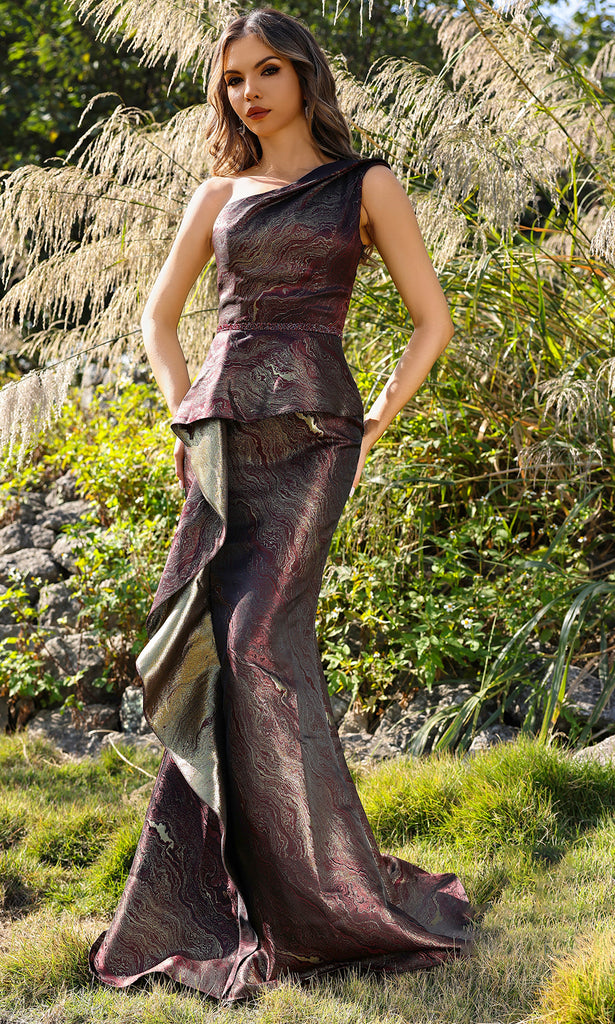The Terani Couture 252E5159 captures attention with its fusion of architectural precision and flowing elegance. A one-shoulder neckline introduces an asymmetrical focal point, complemented by a tailored peplum waist that sculpts and flatters the silhouette. The jacquard fabric adds visual depth, while the sheath skirt reveals cascading side ruffle that moves with captivating grace. Whether gracing a red-carpet event or a lavish formal gathering, this Terani Couture 252E5159 gown allows you to showcase a sense of style that is both bold and refined, ensuring you leave a lasting impression.