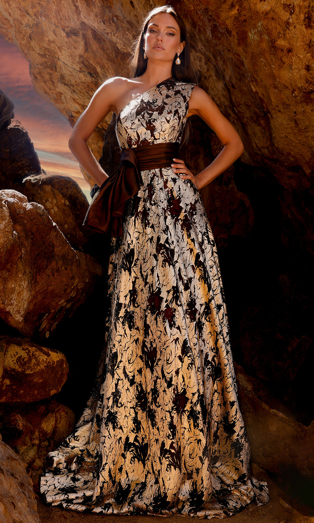 Embrace the art of luxury in Terani Couture 252E5167, a gown that flawlessly blends opulence with graceful design. Its asymmetric neckline is framed by a stunning metallic lace fabric that reflects light beautifully, ensuring you shine from every angle. The ruched wide waistband accented with a dramatic bow, defines the waist and complements the flowing A-line skirt that moves elegantly with every step. This Terani Couture 252E5167 gown is perfect for sophisticated galas, formal weddings, or red-carpet events where impeccable style and refined craftsmanship are paramount. Model is wearing Coffee Gold color.